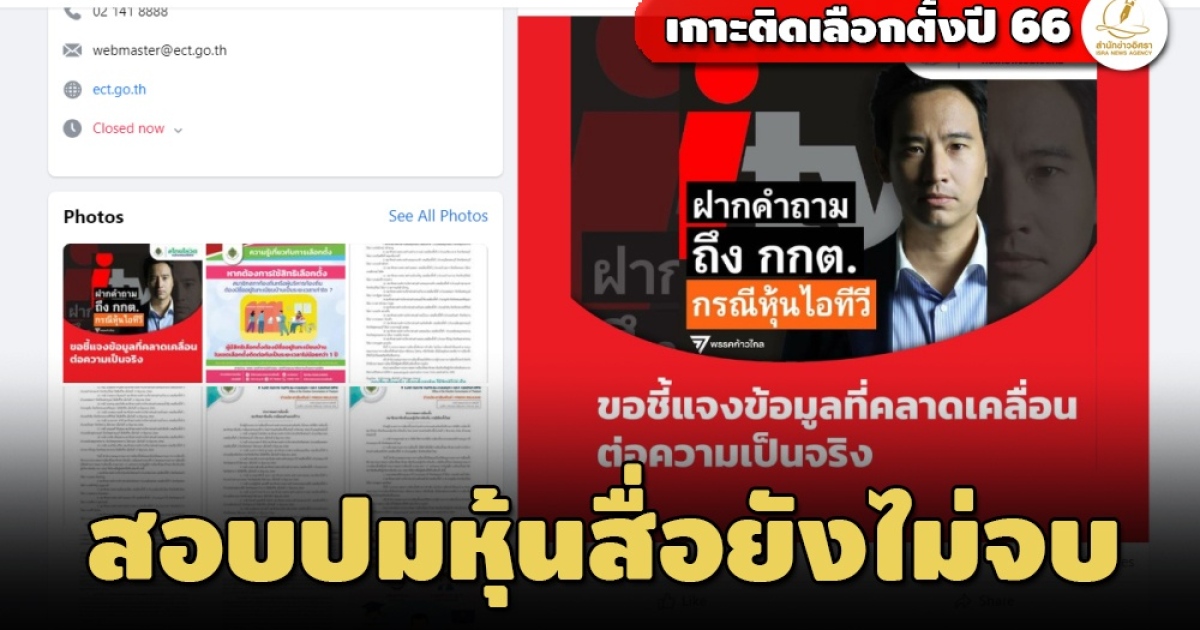 กกต. ขอชี้แจงว่า ในการเลือกตั้ง สส. เป็นการทั่วไป พ.ศ. 2566 มีผู้มีสิทธิเลือกตั้ง จำนวน 3 ราย ได้ยื่นคำร้องต่อสำนักงาน กกต. กล่าวหาว่า นายพิธาฯ เป็นผู้ถือหุ้นบริษัท ไอทีวี จำกัด (มหาชน) จำนวน 42,000 หุ้น อันเป็นกิจการสื่อมวลชน เชื่อว่าเป็นผู้มีลักษณะต้องห้ามตามมาตรา 98 (3) แห่งรัฐธรรมนูญ ฉบับปัจจุบัน แต่คำร้องดังกล่าวยื่นเกินกำหนดระยะเวลาตามที่กฎหมายบัญญัติ กกต. จึงมีมติสั่งไม่รับคำร้องดังกล่าวทั้งหมดไว้พิจารณา
