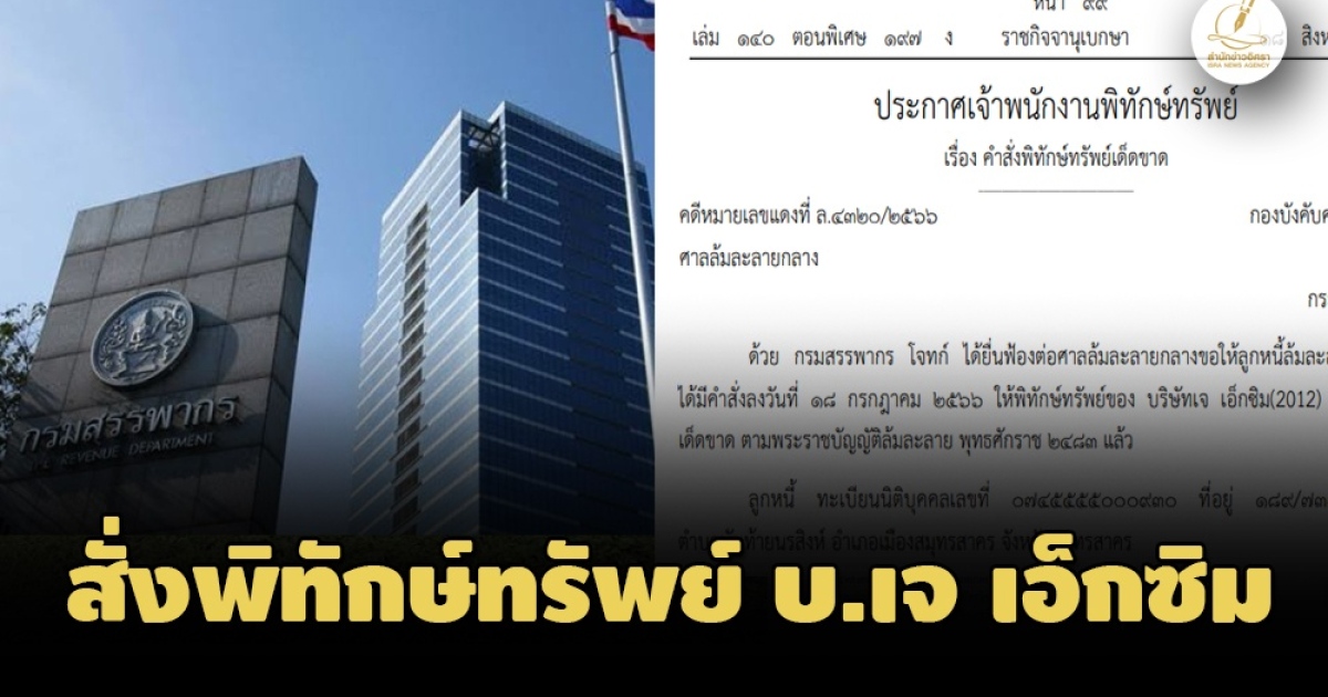 สำนักข่าวอิศรา (www.isranews.org) ราชกิจจานุเบกษา วันที่ 18 ส.ค.2566 เผยแพร่ประกาศเจ้าพนักงานพิทักษ์ทรัพย์ เรื่อง คําสั่งพิทักษ์ทรัพย์เด็ดขาด บริษัท เจ เอ็กซิม(2012) จํากัด โดยกรมสรรพากร โจทก์ คดีหมายเลขแดงที่ ล.4320/2566 ระบุว่า