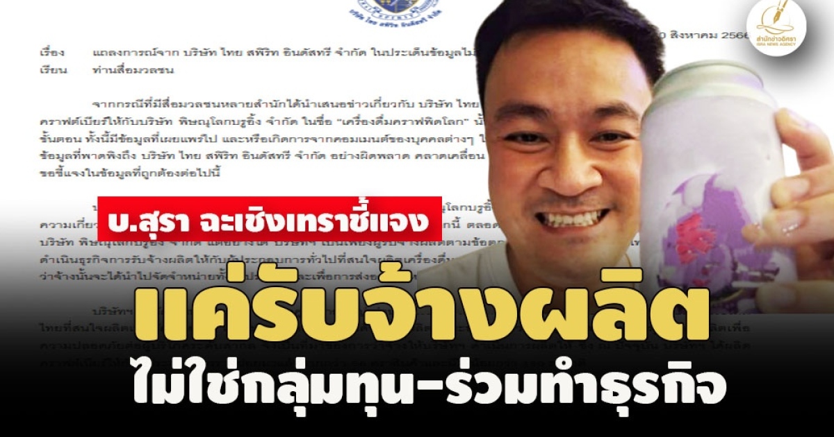 บริษัทไทย สพิริท อินดัสทรี จํากัด ไม่ใช่กลุ่มทุนของบริษัท พิษณุโลกบรูอิ้ง จํากัด หรือ “เครื่องดื่มคราฟพิดโลก” และไม่มี ความเกี่ยวข้องในการขายและการทําการตลาดของเครื่องดื่มคราฟพิดโลกนี้ ตลอดจนมิได้เป็นผู้ถือหุ้นหรือร่วมบริหารจัดการกับ บริษัท พิษณุโลกบรูอิ้ง จํากัด แต่อย่างใด บริษัทฯ เป็นเพียงผู้รับจ้างผลิตตามข้อตกลงการจ้างและรับจ้างเท่านั้น ซึ่งบริษัทฯ ได้ ดําเนินธุรกิจการรับจ้างผลิตให้กับผู้ประกอบการทั่วไปที่สนใจผลิตเครื่องดื่มแอลกอฮอล์ ในรูปแบบของ OEM เพื่อผู้ประกอบการผู้ว่าจ้างนั้นจะได้นําไปจัดจําหน่ายทั้งในประเทศและเพื่อการส่งออกจําหน่ายต่างประเทศด้วยตนเองต่อไป