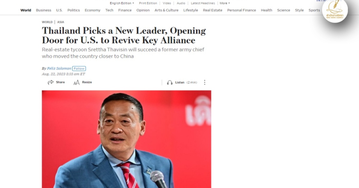วอลสตรีทเจอร์นัล เผย 'เศรษฐา' ได้เป็นนายกฯ เปิดโอกาสสหรัฐฯ ฟื้นสัมพันธ์กับไทย หลังจากไทยโอนเอียงไปหาจีนนานหลายปี ชี้ความสำเร็จของนายกฯ คนใหม่ด้านเศรษฐกิจขึ้นอยู่กับความมั่นคง แต่คดีที่พรรคก้าวไกลเผชิญ อาจนำไปสู่การยุบพรรค-การประท้วงครั้งใหญ่
