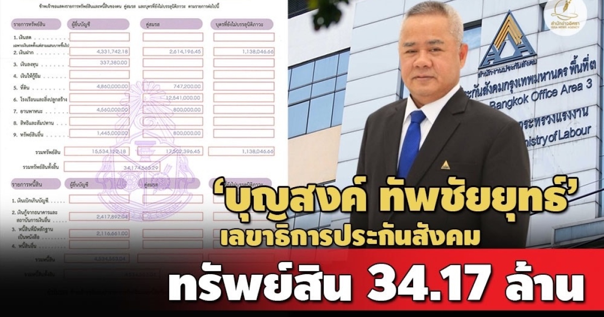 ป.ป.ช.เปิดบัญชีทรัพย์สิน 'บุญสงค์ ทัพชัยยุทธ์' เลขาธิการสำนักงานประกันสังคม มีทรัพย์สินกว่า 34 ล้าน มีที่ดิน 18 ไร่ใน จ.นครนายก สะสมนาฬิกา-สร้อยคอทองคำ-แหวน รายได้ 2.1 ล./ปี