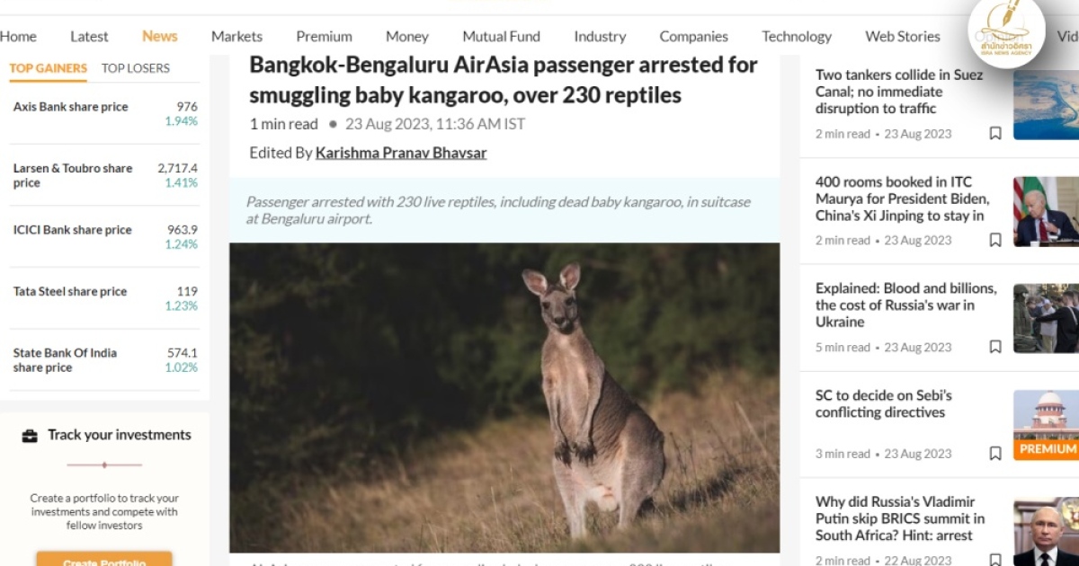 ศุลกากรอินเดีย จับผู้โดยสารเดินทางจากกรุงเทพ ลักลอบขนลูกจิงโจ้-สัตว์เลื้อยคลานกว่า 230 ตัว โชคร้าย ลูกจิงโจ้ขาดอากาศหายใจ ตายระหว่างอยู่ในกระเป๋า เจ้าตัวบอกไม่รู้ว่ามีอะไรในกระเป๋า รู้แค่ว่าผู้มอบกระเป๋าที่กรุงเทพบอกให้ขนมาที่สนามบินเบนกาลูรู