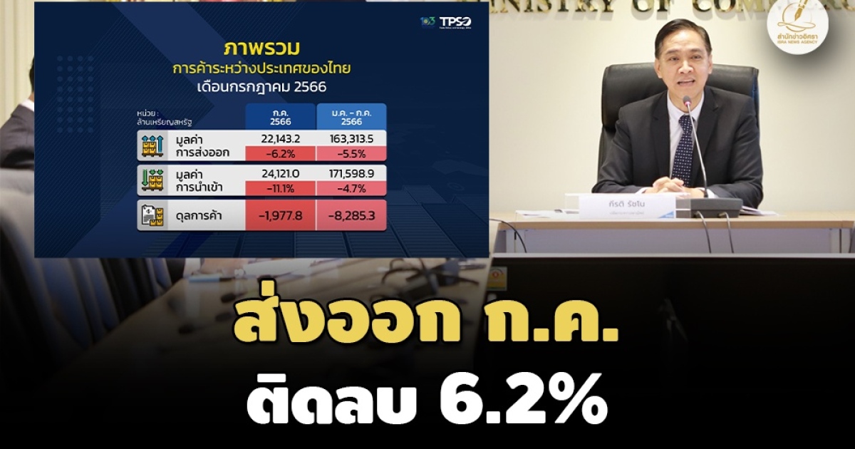 เมื่อวันที่ 25 ส.ค. นายกีรติ รัชโน ปลัดกระทรวงพาณิชย์ แถลงภาวะการค้าระหว่างประเทศของไทย เดือน ก.ค. 2566 ว่า การส่งออกไทยในเดือน ก.ค.2566 มีมูลค่า 22,143.2 ล้านดอลลาร์สหรัฐ หดตัว 6.2% เมื่อเทียบกับช่วงเดียวกันของปีก่อน ส่วนการนำเข้า มีมูลค่า 24,121.0 ล้านดอลลาร์สหรัฐ หดตัว 11.1% เมื่อเทียบกับช่วงเดียวกันของปีก่อน ขณะที่ในเดือน ก.ค.2566 ไทยขาดดุลการค้า มูลค่า 1,977.8 ล้านดอลลาร์สหรัฐ