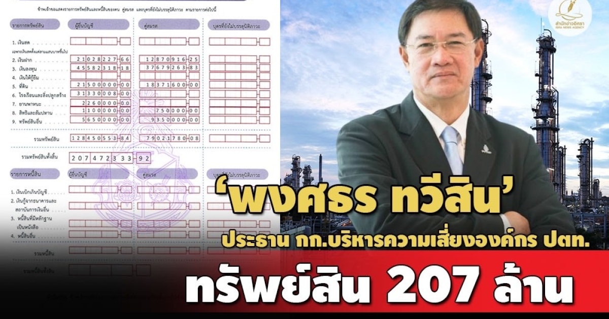 ป.ป.ช. เปิดบัญชีทรัพย์สิน 'พงศธร ทวีสิน' กรรมการ/ประธานกรรมการบริหารความเสี่ยงองค์กร บริษัท ปตท. จำกัด (มหาชน) มีทรัพย์สินรวมกว่า 207 ล้าน มีรถยนต์ 3 คัน สะสมพระเลี่ยมทอง-นาฬิกาผู้ชาย รายได้ 7.7 ล้านต่อปี