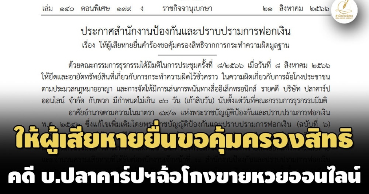 สำนักข่าวอิศรา (www.isranews.org) รายงานว่า ราชกิจจานุเบกษา วันที่ 21 ส.ค.2566 เผยแพร่ประกาศสำนักงานป้องกันและปราบปรามการฟอกเงิน เรื่อง ให้ผู้เสียหายยื่นคำร้องขอคุ้มครองสิทธิจากการกระทำความผิดมูลฐาน รายคดี บริษัท ปลาคาร์ป ออนไลน์ จำกัด กับพวก ความว่า