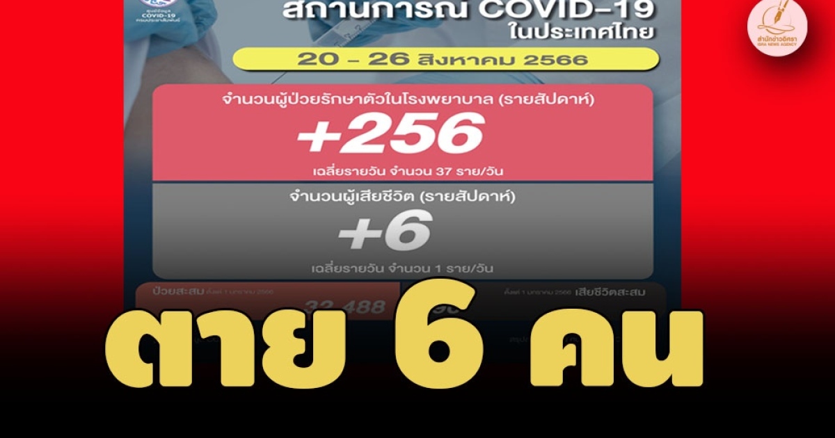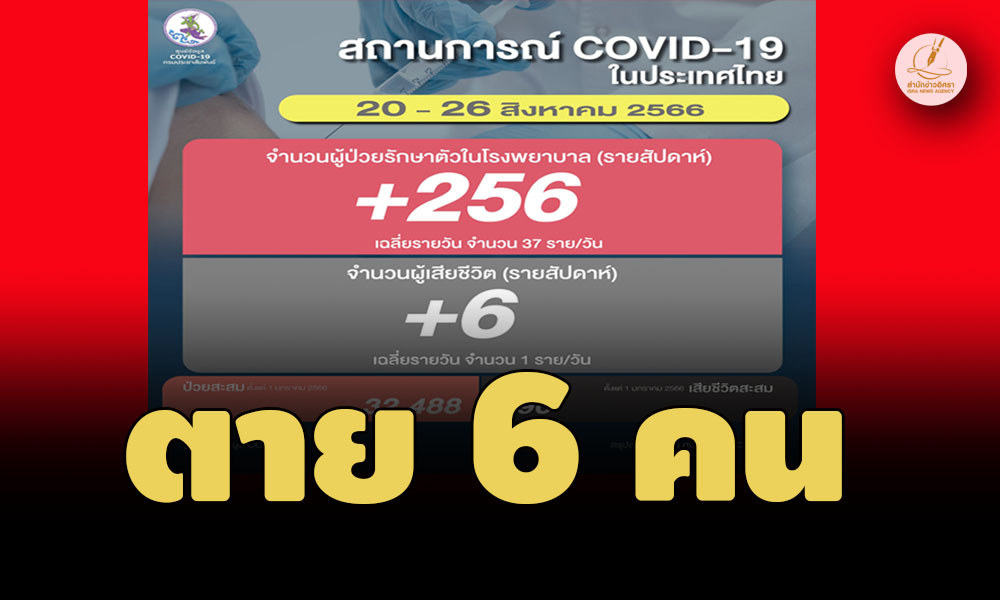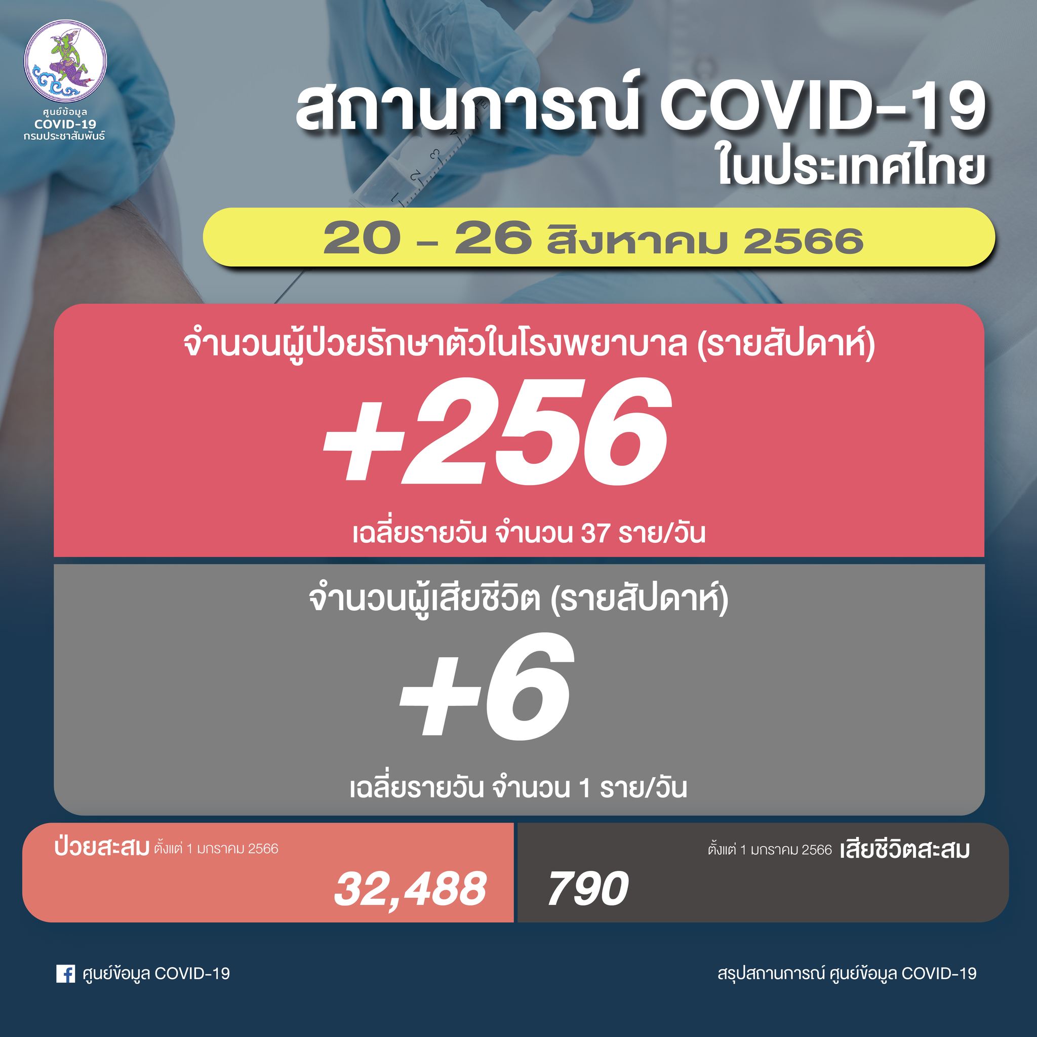 สถานการณ์โควิดไทย สัปดาห์ล่าสุด 20- 26 ส.ค.66 มีผู้ป่วยใหม่รักษาตัวใน รพ.เพิ่ม 256 ราย 37 คน/วัน เสียชีวิตเพิ่มอีก 6 ราย เฉลี่ยวันละ 1