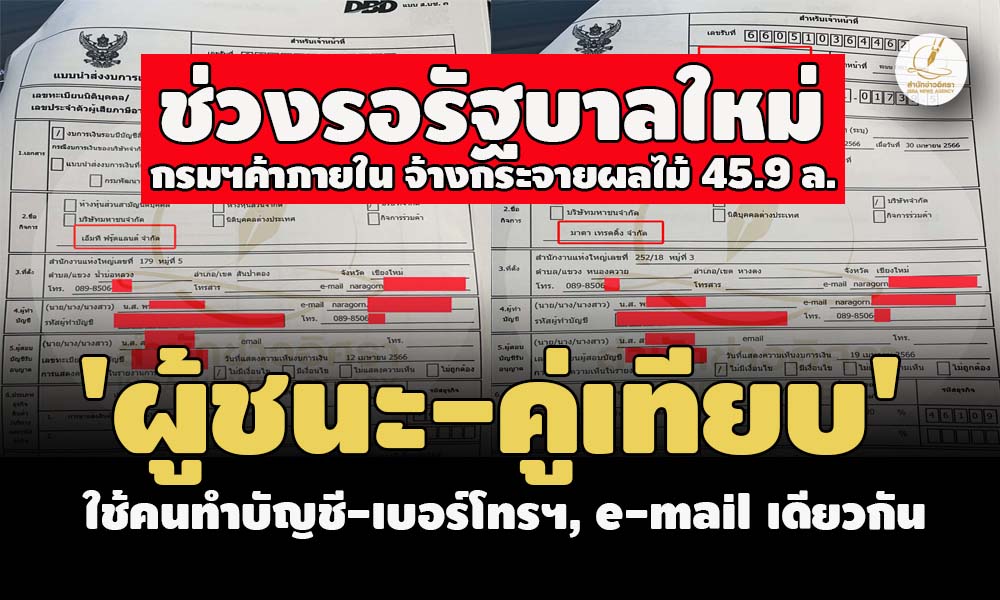 หลัง กรมฯค้าภายใน แจงเหตุใช้วิธีคัดเลือกจ้างงานกระจายผลไม้หลายสัญญา 200 ล. ช่วงเปลี่ยนผ่านรัฐบาลใหม่ 'อิศรา' สุ่มตรวจงานจ้างกระจายผลไม้ 45.9 ล. พบ 'ผู้ชนะ-คู่เทียบ' ใช้คนทำบัญชี - แจ้งเบอร์โทรฯ,e-mail ติดต่อสำนักงานเหมือนกัน