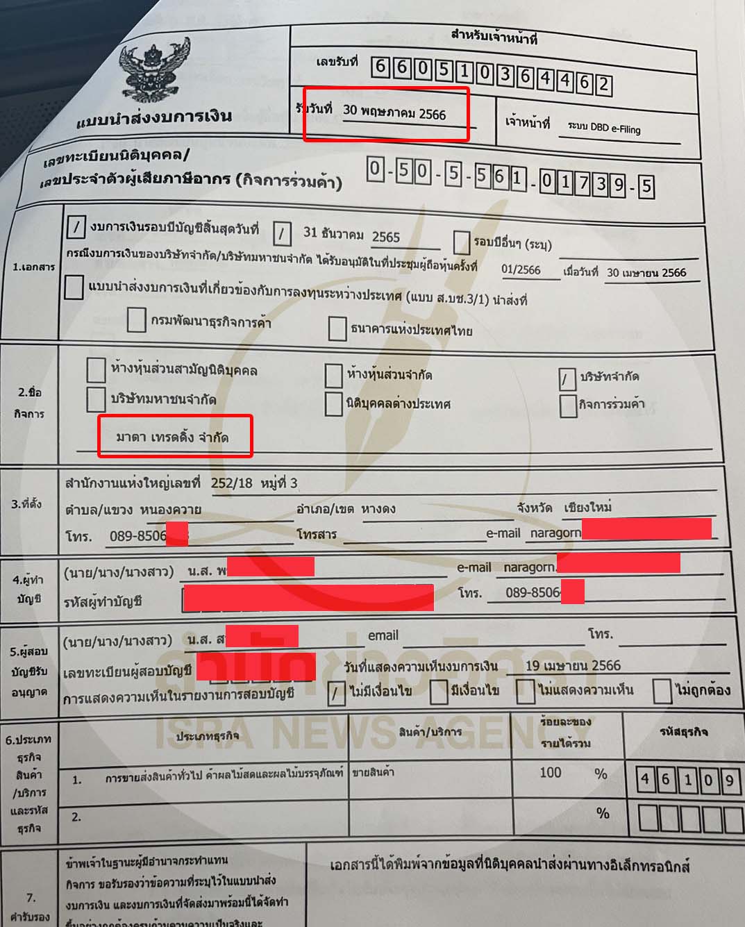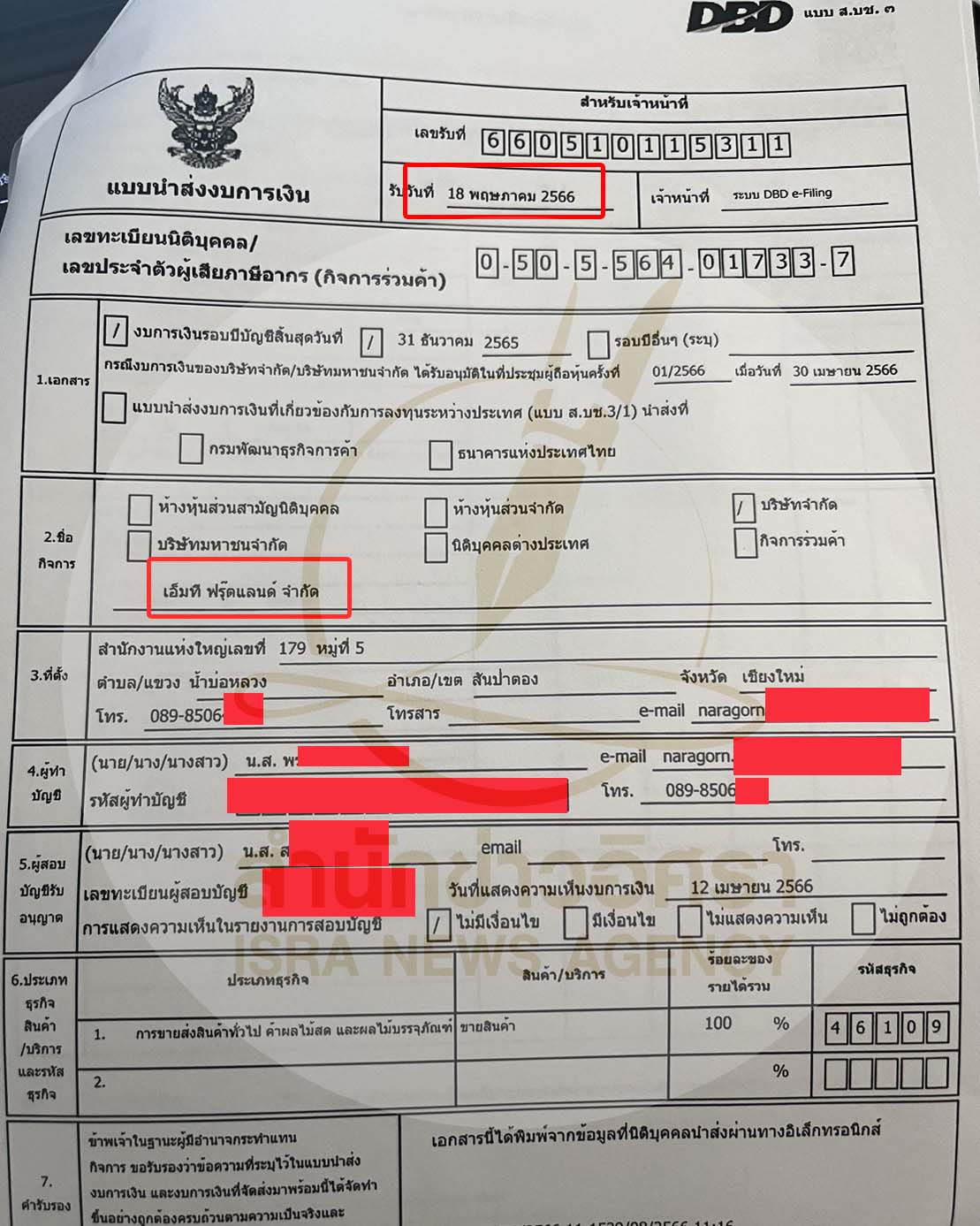 ทั้งนี้ การแจ้งข้อมูลแบบนำส่งงบการเงิน แบบ ส.บช.3 ที่นำส่งต่อกรมพัฒนาธุรกิจการค้า ของ บริษัท เอ็มที ฟรุ๊ตแลนด์ จำกัด คือวันที่ 18 พ.ค.2566 ,บริษัท มาตาเทรดดิ้ง จำกัด คือวันที่ 30 พ.ค.2566