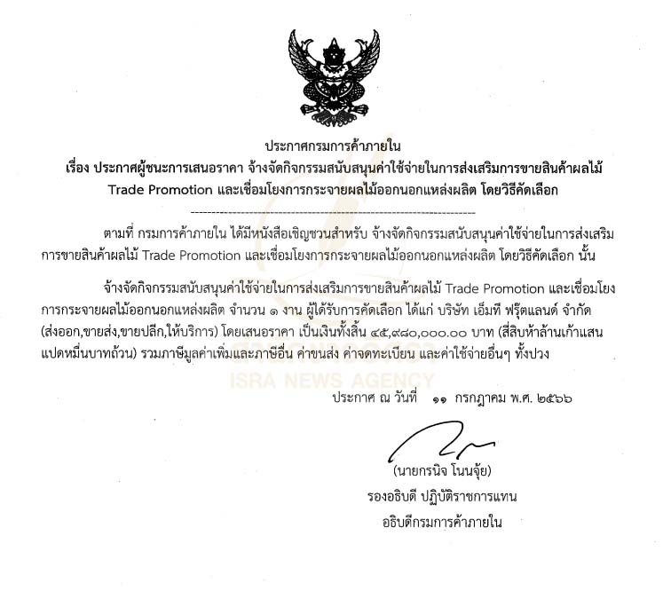 เกิดขึ้นก่อนที่ กรมการค้าภายใน จะประกาศผลให้ บริษัท เอ็มที ฟรุ๊ตแลนด์ จำกัด เป็นผู้ชนะ เป็นทางการเมื่อวันที่ 11 ก.ค.2566 ลงนามในประกาศ โดยนายกรนิจ โนนจุ้ย รองอธิบดี ปฏิบัติราชการแทน อธิบดีกรมการค้าภายใน (ดูเอกสาร)