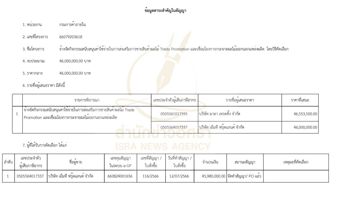เมื่อ สำนักข่าวอิศรา สุ่มตรวจข้อมูลเชิงลึกงานจัดซื้อจัดจ้างโครงการที่เกี่ยวข้องกับการกระจายผลไม้ออกนอกแหล่งผลิต ของ กรมการค้าภายใน จำนวน 1 โครงการ ที่มีการประกาศผลในช่วงเดือนก.ค.2566 คือ งานจ้างจัดกิจกรรมสนับสนุนค่าใช้จ่ายในการส่งเสริมการขายสินค้าผลไม้ Trade Promotion และเชื่อมโยงการกระจายผลไม้ออกนอกแหล่งผลิต โดยวิธีคัดเลือก ที่ปรากฏชื่อ บริษัท เอ็มที ฟรุ๊ตแลนด์ จำกัด เป็นผู้ชนะ วงเงิน 45,980,000 บาท