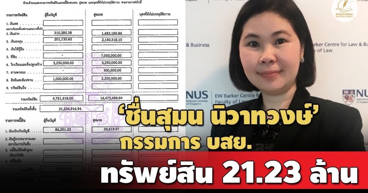 โดย นางชื่นสุมน พร้อมด้วย นายถนัดกิจ นิวาทวงษ์ คู่สมรส แจ้งมีทรัพย์สินทั้งสิ้น 21,234,916 บาท หนี้สิน 125,821 บาท