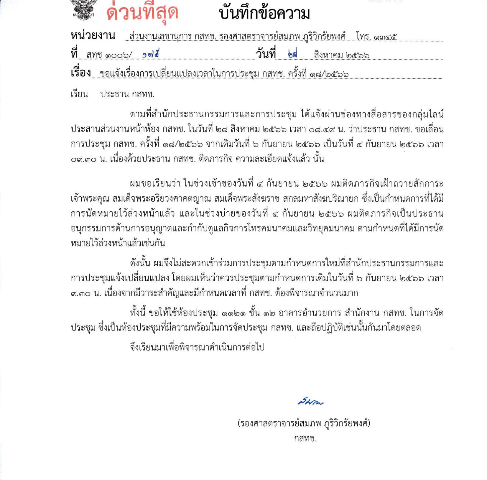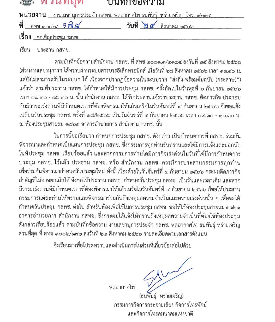 แหล่งข่าวกล่าวว่า สาเหตุที่ กสทช.ทั้ง 4 รายทำบันทึกดังกล่าวเนื่องจากประธาน กสทช.ได้ขอเปลี่ยนวันประชุมคณะกรรมการ กสทช.จากวันพุธที่ 6 กันยายน 2566 ซึ่งเป็นการกำหนดการประชุมที่กำหนดไว้ล่วงโดยการตกลงร่วมกันของ กสทช.ทั้งหมด เป็นวันจันทร์ที่ 4 กันยายน 2566 โดยอ้างว่ามีภารกิจเร่งด่วนที่ต้องเดินทางไปต่างประเทศในวันที่ 5 กันยายน โดยมีการบรรจุวาระการพิจารณาคัดเลือกเลขาธิการ กสทช.ไว้ในวาระการประชุมวันที่ 4 กันยายนด้วย