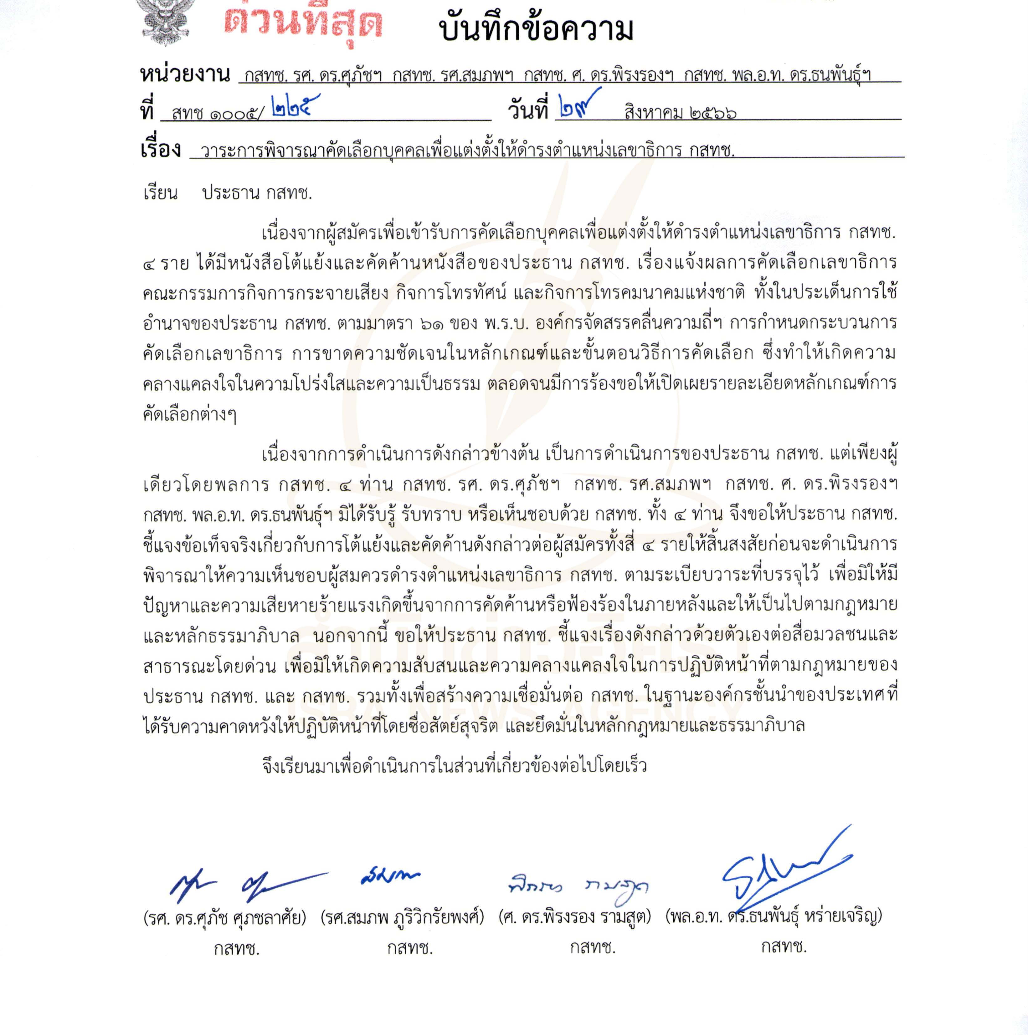 กสทช. 4 ราย ผนึกกำลังทำบันทึกถึงประธาน ‘สรณ บุญใบชัยพฤกษ์’ ชี้แจงปมคัดเลือก ‘เลขาธิการ’ ต่อผู้สมัคร 4 รายที่หนังสือคัดค้านโต้แย้งความโปร่งใสในกระบวนการพิจารณาให้สิ้นสงสัยก่อนเห็นชอบ เหตุเลื่อนวันประชุมคณะกรรมการกระทันหันมีวาระพิจารณาคัดเลือกเลขาธิการด้วย