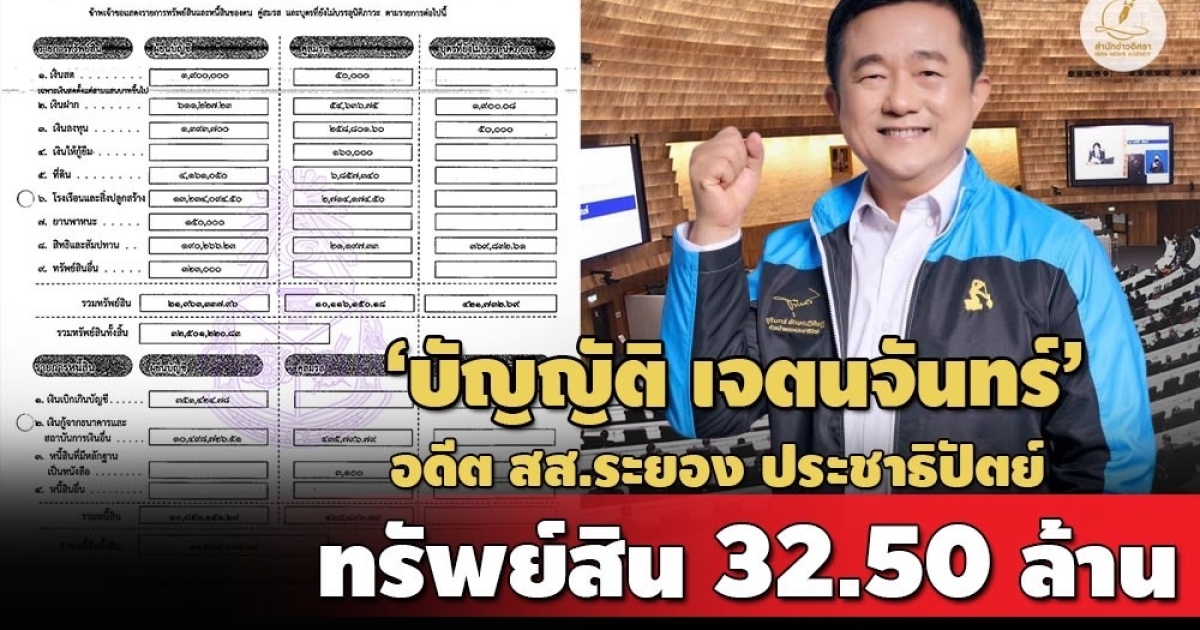 ป.ป.ช.เปิดบัญชีทรัพย์สิน 'บัญญัติ เจตนจันทร์' กรณีพ้นตำแหน่ง สส.ระยอง พรรคประชาธิปัตย์ 20 มี.ค.2566 มีทรัพย์สินกว่า 32 ล้าน มีตึกแถว 6 ตึก ห้องแถว 3 ห้อง ที่ดิน 20 แปลง ปืนพก 2 กระบอก เปียโน 1 หลัง รายได้ 2.9 ล./ปี ภรรยามีตึกแถว 2 หลัง