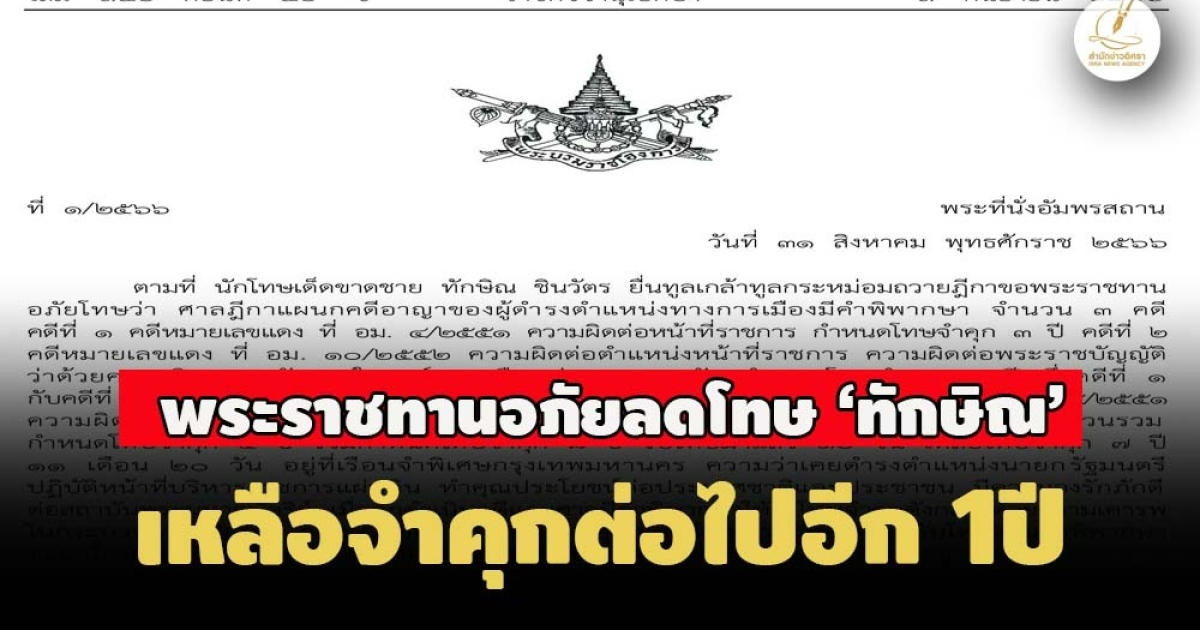 สำนักข่าวอิศรา (www.isranews.org) รายงานว่า เมื่อวันที่ 1 ก.ย.2566 ราชกิจจานุเบกษา ได้เผยแพร่พระบรมราชโองการ พระบาทสมเด็จพระปรเมนทรรามาธิบดีศรีสินทรมหาวชิราลงกรณพระวชิรเกล้าเจ้าอยู่หัว เมื่อวันที่ 31 ส.ค.2566 พระราชทานพระมหากรุณาอภัยลดโทษให้นักโทษเด็ดขาดชาย ทักษิณ ชินวัตร เหลือโทษจำคุกต่อไป อีก 1 ปี ตามกำหนดโทษตามคำพิพากษาเพื่อจะได้ใช้ความรู้ความสามารถ ประสบการณ์ช่วยเหลือและทำคุณประโยชน์แก่ประเทศชาติ สังคมและประชาชน สืบไป