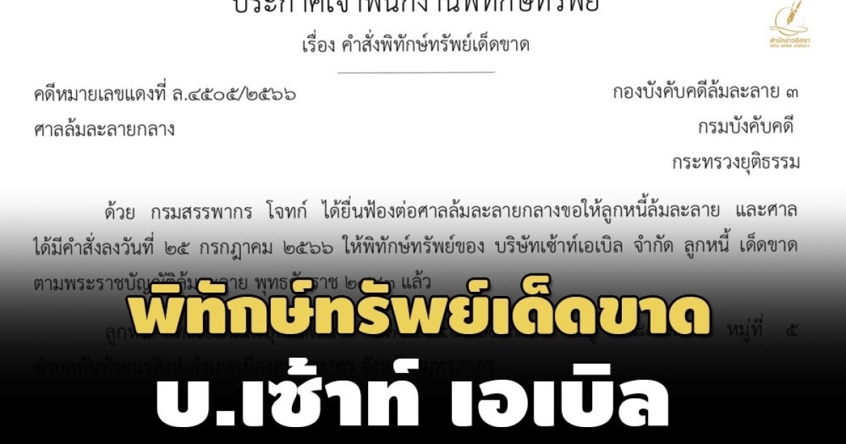 สำนักข่าวอิศรา (www.isranews.org) รายงานว่า วันที่ 30 ส.ค.2566 ราชกิจจานุเบกษา เผยแพร่ ประกาศเจ้าพนักงานพิทักษ์ทรัพย์ เรื่อง คําสั่งพิทักษ์ทรัพย์เด็ดขาด ราย บริษัทเซ้าท์ เอเบิล จํากัด คดีหมายเลขแดงที่ ล.4505/2566 ความว่า