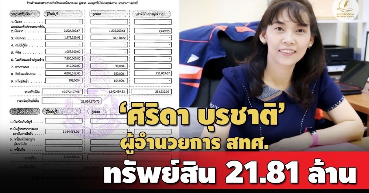 โดย นางศิริดา พร้อมด้วย นายวัชระ บุรชาติ และบุตรที่ยังไม่บรรลุนิติภาวะ แจ้งมีทรัพย์สินทั้งสิ้น 21,818,170 บาท หนี้สิน 3,354,958 บาท