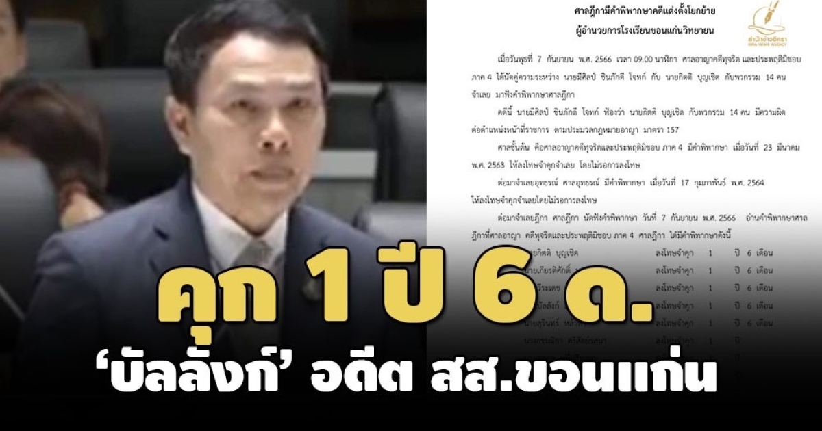 ศาลฎีกา พิพากษาจำคุก 1 ปี 6 ด. 'บัลลังก์ อรรณนพพร' อดีต สส.ขอนแก่น คดีแต่งตั้งโยกย้าย ผอ.รร.ขอนแก่นวิทยายน มิชอบ พวกกก.สถานศึกษาโดนด้วย 12 ราย เฉลี่ยคนละปี