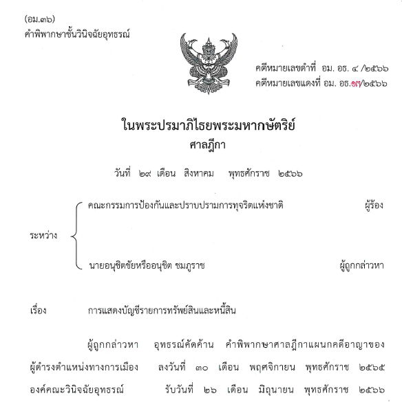 สำนักข่าวอิศรา (www.isranews.org) วันที่ 29 สิงหาคม 2566 องค์คณะวินิจฉัยอุทธรณ์ในศาลฎีกาพิพากษายืนตามศาลฎีกาแผนกคดีอาญาของผู้ดำรงตำแหน่งทางการเมือง คดี นายอนุชิตชัยหรืออนุชิต ชมภูราช สมาชิกสภาเทศบาลนครสกลนคร จงใจไม่ยื่นบัญชีแสดงรายการทรัพย์สินและหนี้สินและเอกสารประกอบต่อคณะกรรมการป้องกันและปราบปรามการทุจริตแห่งชาติ ผู้ร้อง โดยไม่ยื่นเอกสารหลักฐานที่พิสูจน์ความมีอยู่จริงของทรัพย์สินและหนี้สินรวม 11 รายการ และมีพฤติการณ์อันควรเชื่อได้ว่ามีเจตนาไม่แสดงที่มาแห่งทรัพย์สินหรือหนี้สินนั้น กรณีพ้นจากตำแหน่งฯ