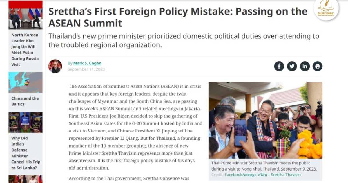 เรียบเรียงจาก:https://thediplomat.com/2023/09/sretthas-first-foreign-policy-mistake-passing-on-the-asean-summit/