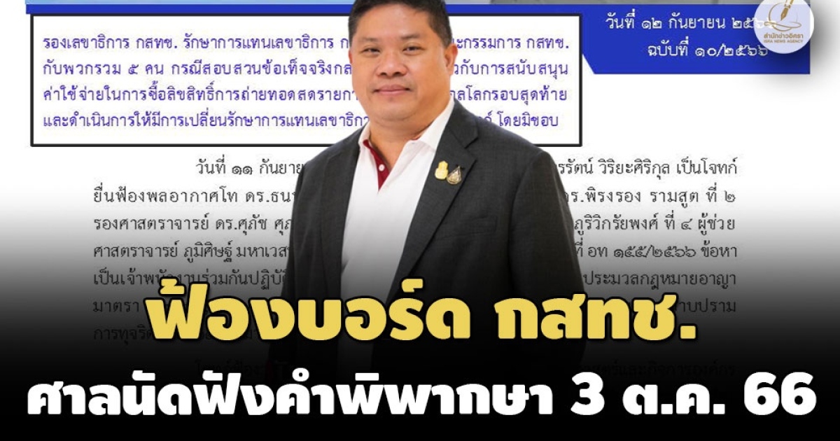สำนักข่าวอิศรา (www.isranews.org) รายงานว่า เมื่อวันที่ 12 ก.ย. ศาลอาญาคดีทุจริตและประพฤติมิชอบกลาง เผยแพร่เอกสารข่าวโดยเนื้อหาว่า เมื่อวันที่ 11 ก.ย.2566 เวลา 10.30 น. นายไตรรัตน์ วิริยะศิริกุล รักษาการแทนเลขาธิการคณะกรรมการกิจการกระจายเสียง กิจการโทรทัศน์ และกิจการโทรคมนาคมแห่งชาติ (กสทช.) เป็นโจทก์ ยื่นฟ้อง พล.อ.ท.ดร.ธนพันธุ์ หร่ายเจริญ กรรมการ กสทช. (จำเลยที่ 1) , ศ.ดร.พิรงรอง รามสูต กรรมการ กสทช. (จำเลยที่ 2) , รศ.ดร.ศุภัช ศุภชลาศัย กรรมการ กสทช. (จำเลยที่ 3)