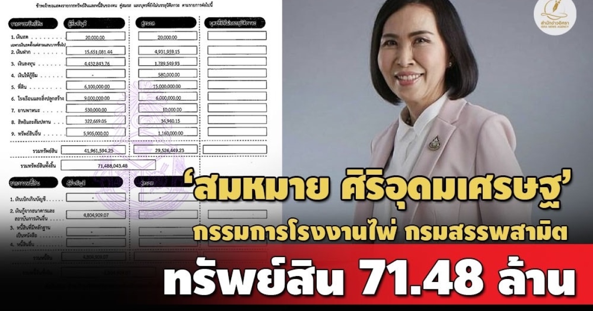 โดย นางสมหมาย พร้อมด้วย นายอนุชิต ศิริอุดมเศรษฐ แจ้งมีทรัพย์สินทั้งสิ้น 71,488,043 บาท หนี้สิน 4,804,909 บาท