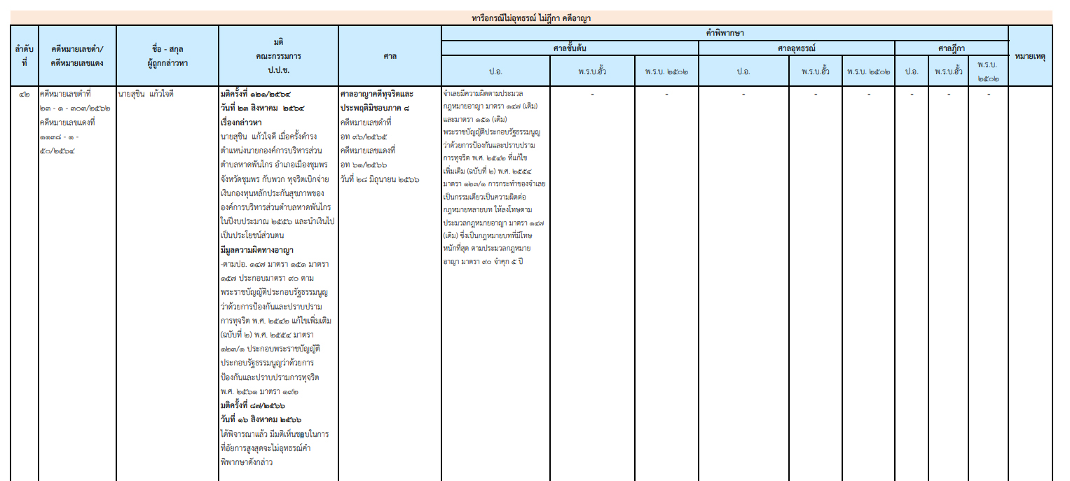 ป.ป.ช.เผยแพร่ผลคดีกล่าวหา 'สุชิน แก้วใจดี' อดีตนายก อบต.หาดพันไกร ชุมพร ทุจริตเบิกจ่ายเงินกองทุนหลักประกันสุขภาพ อบต. ปีงบประมาณ 2556 นำเงินไปเป็นประโยชน์ส่วนตน ล่าสุด ศาลอาญาคดีทุจริตประพฤติมิชอบภาค 8 พิพากษาลงโทษ จำคุก 5 ปี ไม่รอลงอาญา