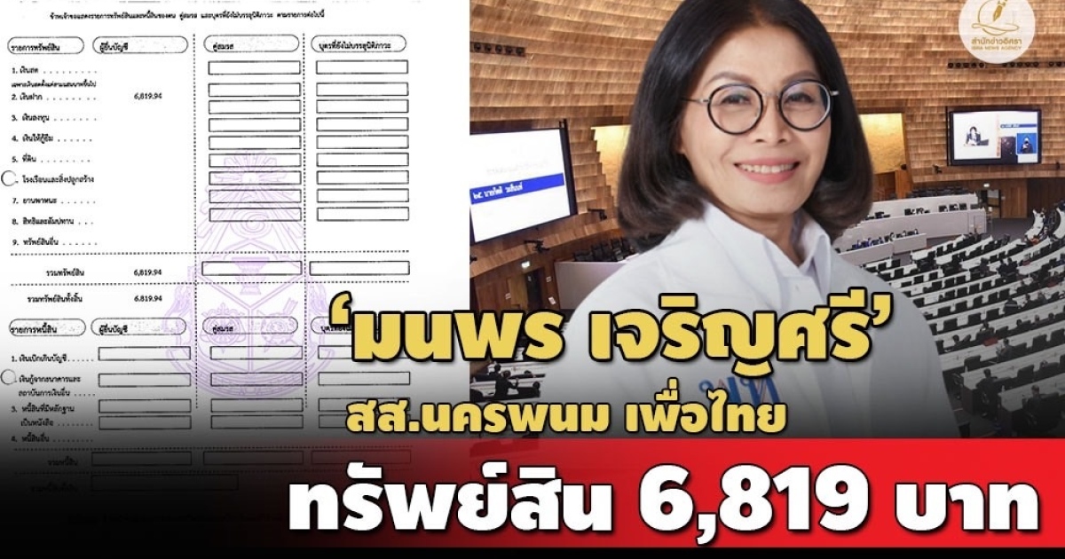 ป.ป.ช.เปิดบัญชีทรัพย์สิน 'มนพร เจริญศรี' รมช.คมนาคม-สส.นครพนม พรรคเพื่อไทย มีทรัพย์สินเพียง 6,819 บาท เป็นเงินฝาก 3 บัญชี แต่แจ้งมีรายได้ 1.3 ล./ปี