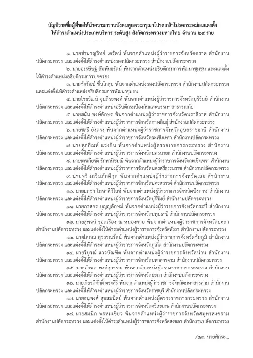 17. นายอนุพงศ์ สุขสมนิตย์ พ้นจากตำแหน่งผู้ตรวจราชการกระทรวง สำนักงานปลัดกระทรวง และแต่งตั้งให้ดำรงตำแหน่งผู้ว่าราชการจังหวัดศรีสะเกษ สำนักงานปลัดกระทรวง