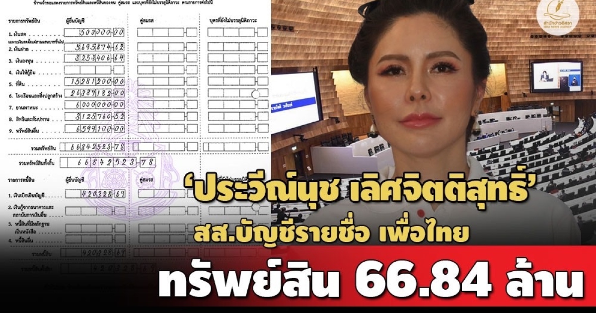 ป.ป.ช.เปิดบัญชีทรัพย์สิน 'ประวีณ์นุช เลิศจิตติสุทธิ์' สส.บัญชีรายชื่อ พรรคเพื่อไทย ทรัพย์สินกว่า 66 ล้าน มีห้องชุด 3 ห้องใน กทม. รถ Porsche 1 คัน สะสมสร้อยเพชร-แหวนเพชร-นาฬิกา-ทองคำแท่ง รายได้ 1.3 ล./ปี