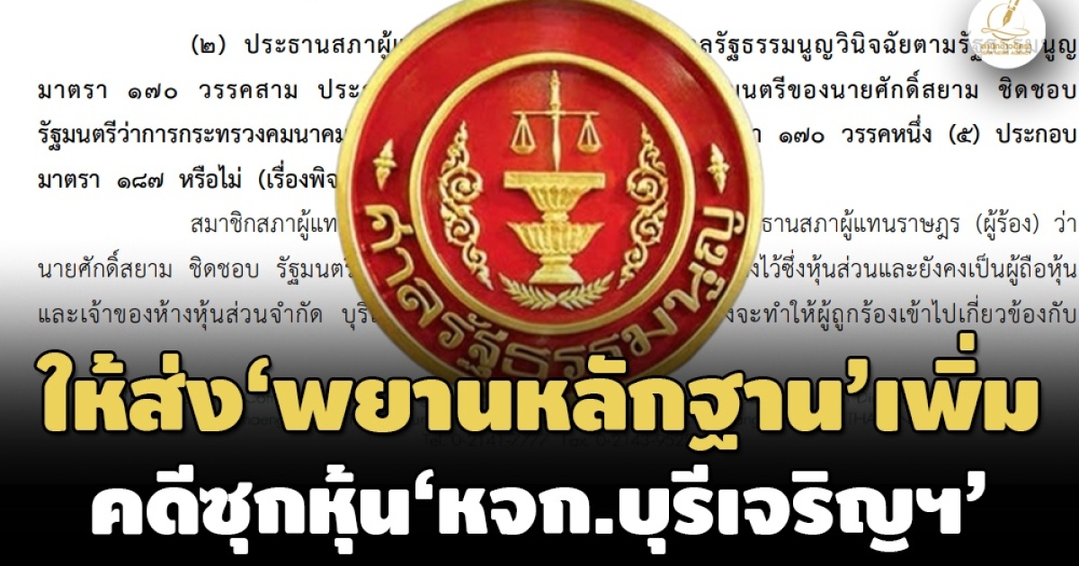 ‘ศาลรัฐธรรมนูญ’ ให้ ‘บุคคล-หน่วยงาน' ที่เกี่ยวข้อง’ ส่งคำชี้แจง-พยานหลักฐาน 'เพิ่มเติม' คดีกล่าวหา ‘ศักดิ์สยาม’ เป็นเจ้าของหุ้น ‘หจก.บุรีเจริญฯ เพื่อประโยชน์แห่งการพิจารณาคดี