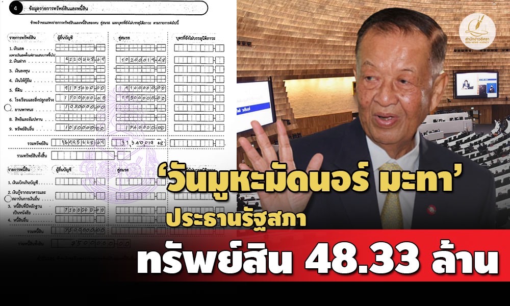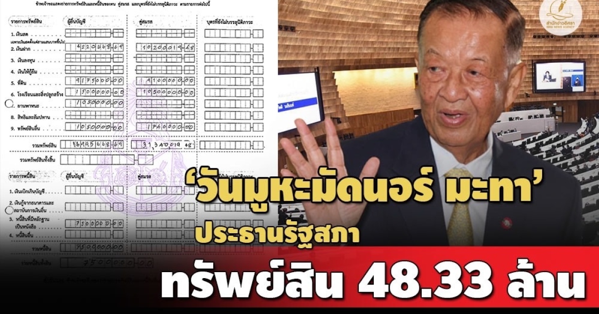 ป.ป.ช.เปิดบัญชีทรัพย์สิน 'วันมูหะมัดนอร์ มะทา' ประธานรัฐสภา กรณีเข้ารับตำแหน่ง สส.บัญชีรายชื่อ พรรคประชาชาติ ทรัพย์สินกว่า 48 ล้าน มีที่ดิน 26 แปลง รถยนต์ 4 คัน สะสมนาฬิกา-แหวน-อาวุธปืน ภรรยามีเงินฝาก 10 ล้าน ทาวน์เฮาส์ 3 หลัง