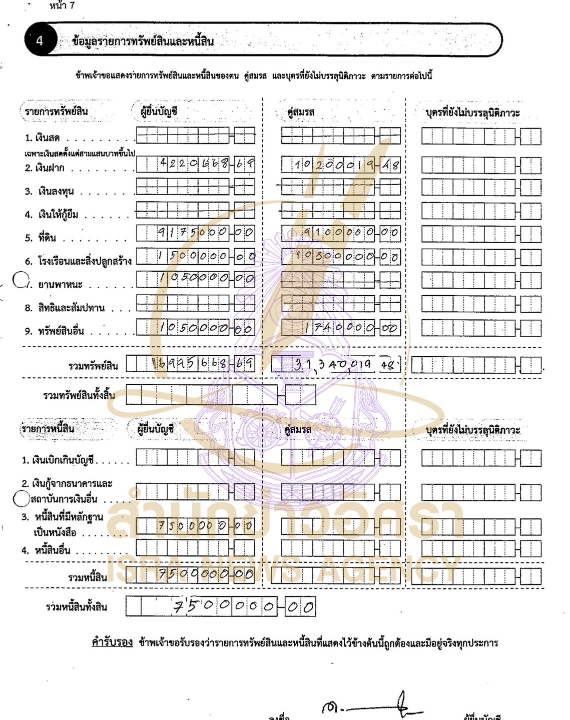 ส่วนหนี้สิน 7,500,000 บาท เป็นหนี้สินที่มีหลักฐานเป็นหนังสือ ระบุผู้ให้กู้ยืม นางจุฑารัตน์ วงษ์พานิช จำนวน 4 สัญญา