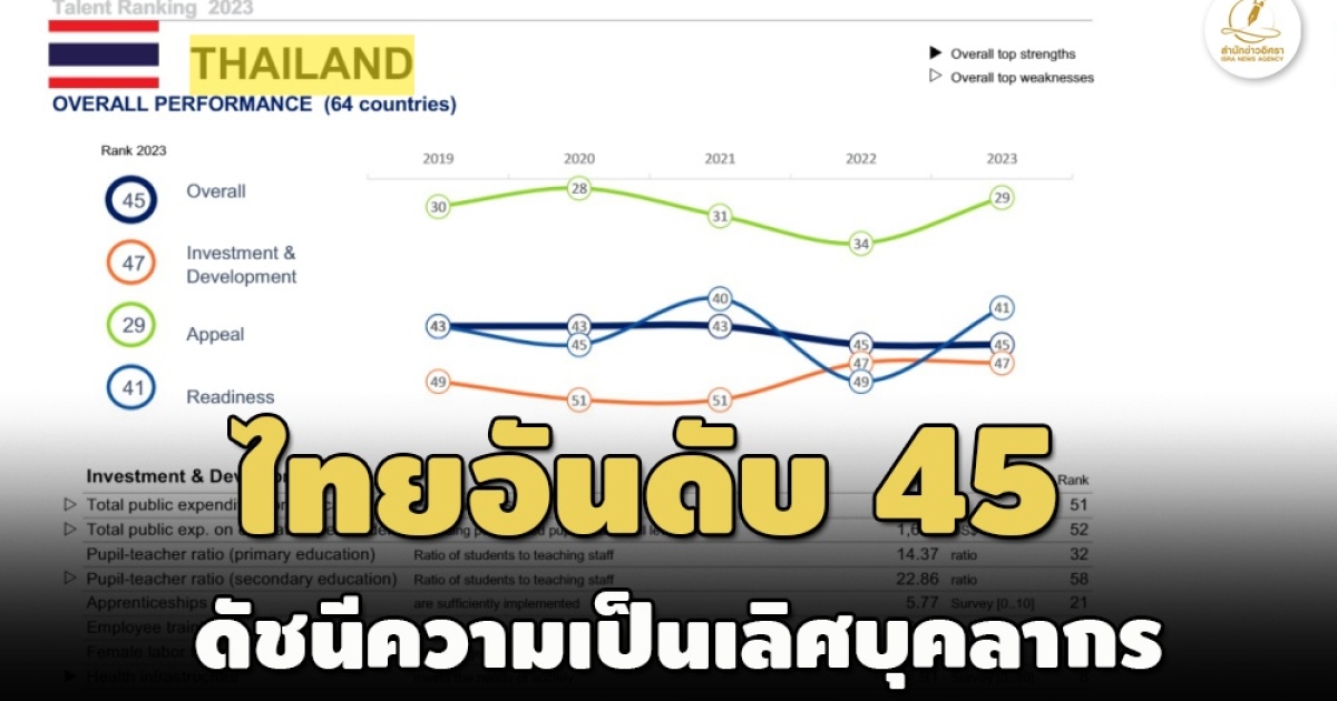สถาบันสวิสจัดดัชนีความเป็นเลิศบุคลากร ไทยติดอันดับ 45 จาก 64 ประเทศ อันดับเท่าปี 65 พบคะแนนดีสุดเรื่องโครงสร้างพื้นฐานการแพทย์ การเก็บภาษี แย่สุดเรื่องอัตรานักเรียนต่อครู ปัญหามลภาวะ