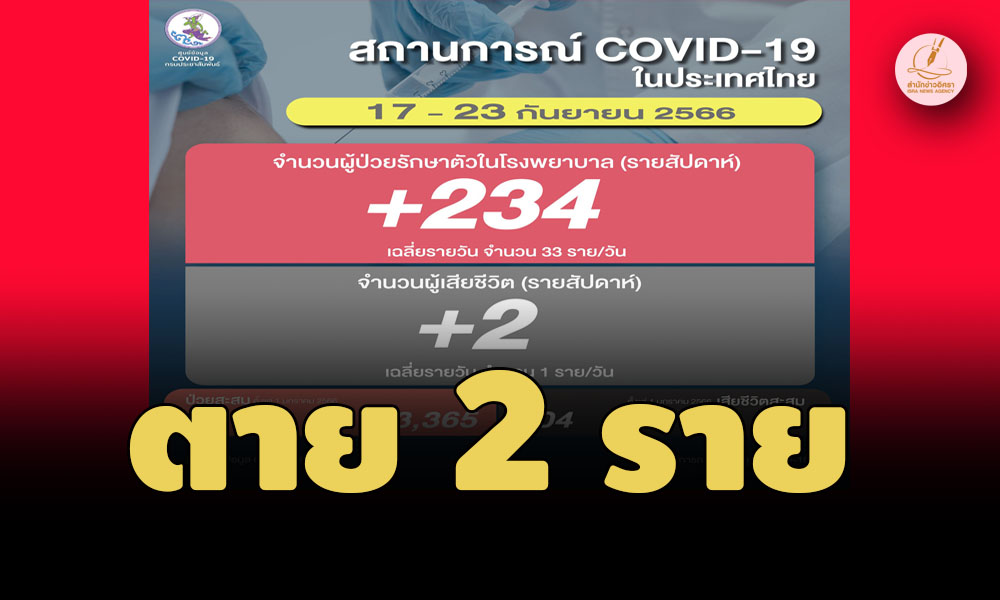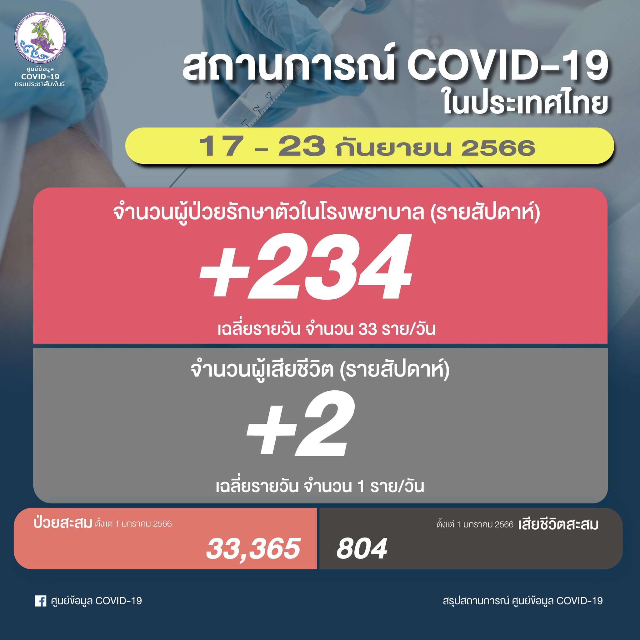 สถานการณ์โควิดไทย สัปดาห์ล่าสุด 17-23 ก.ย.66 มีผู้ป่วยใหม่รักษาตัวใน รพ.เพิ่ม 234 ราย เฉลี่ย 33 คน/วัน เสียชีวิตเพิ่มอีก 2 ราย ยอดรวมตายสะสม 804 ราย