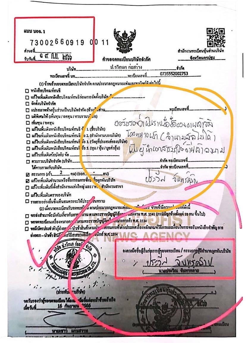ขณะที่ช่วงเวลาดังกล่าว การจดทะเบียนเปลี่ยนแปลงกรรมการบริษัทฯเมื่อวันที่ 19 ก.ย. 2566 และหนังสือรับรองการประชุมผู้ถือหุ้น เมื่อวันที่ 16 ก.ย.2566 ตามปรากฏในเอกสาร เกิดขึ้นภายหลังจาก เจ้าหน้าที่ตำรวจ กองบังคับการปราบปราม นำตัวนายประวีณขึ้นศาลอาญารัชดา เพื่อยื่นฝากขัง เมื่อวันที่ 9 กันยายน 2566 และถูกส่งตัวเข้าเรือนจำพิเศษกรุงเทพมหานครทันที