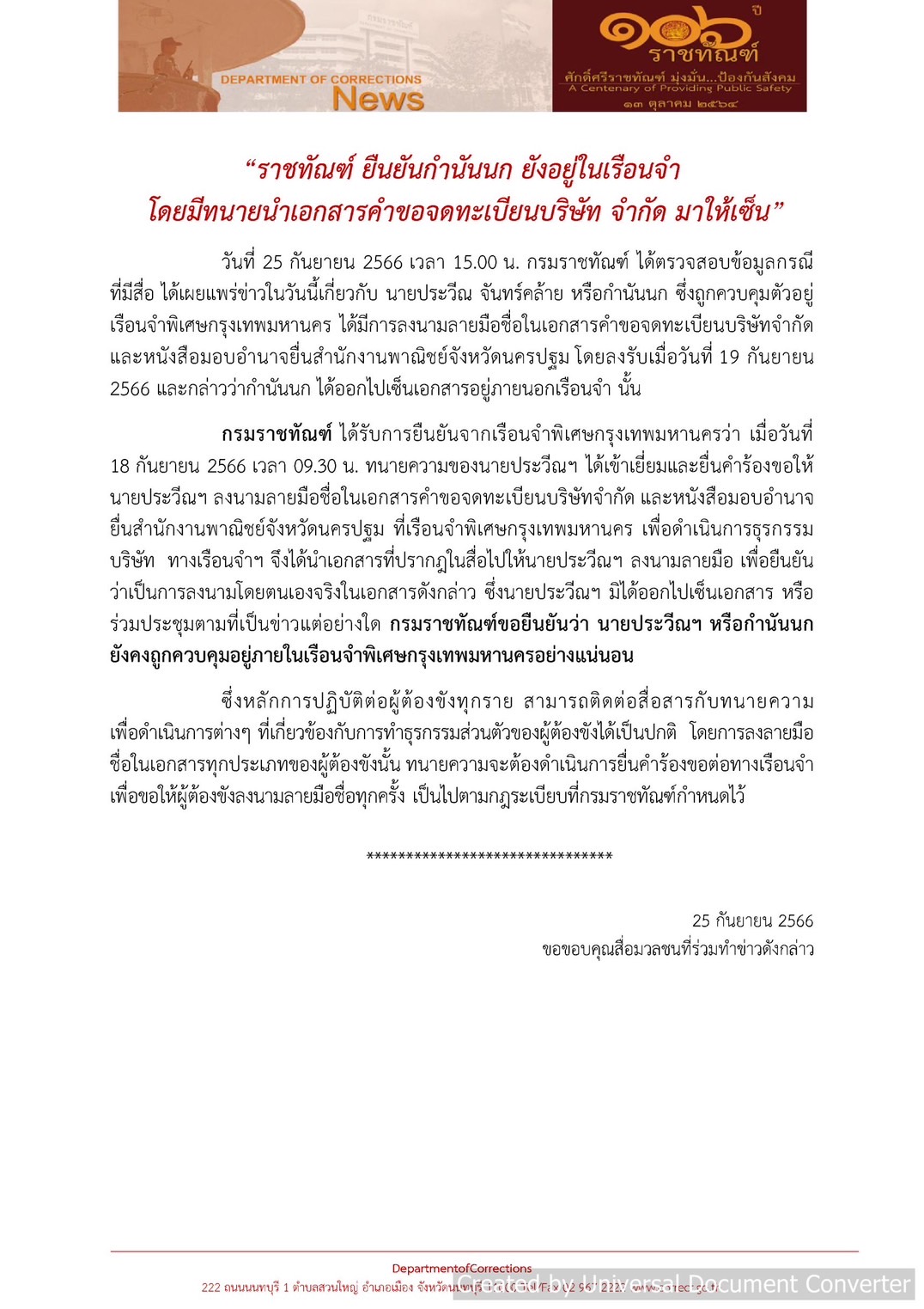 กรมราชทัณฑ์ ได้รับการยืนยันจากเรือนจำพิเศษกรุงเทพมหานครว่า เมื่อวันที่ 18 กันยายน 2566 เวลา 09.30 น. ทนายความของนายประวีณฯ ได้เข้าเยี่ยมและยื่นคำร้องขอให้นายประวีณฯ ลงนามลายมือชื่อในเอกสารคำขอจดทะเบียนบริษัทจำกัด และหนังสือมอบอำนาจยื่นสำนักงานพาณิชย์จังหวัดนครปฐม ที่เรือนจำพิเศษกรุงเทพมหานคร เพื่อดำเนินการธุรกรรมบริษัท ทางเรือนจำฯ จึงได้นำเอกสารที่ปรากฎในสื่อไปให้นายประวีณฯ ลงนามลายมือ เพื่อยืนยันว่าเป็นการลงนามโดยตนเองจริงในเอกสารดังกล่าว ซึ่งนายประวีณฯ มิได้ออกไปเซ็นเอกสาร หรือร่วมประชุมตามที่เป็นข่าวแต่อย่างใด