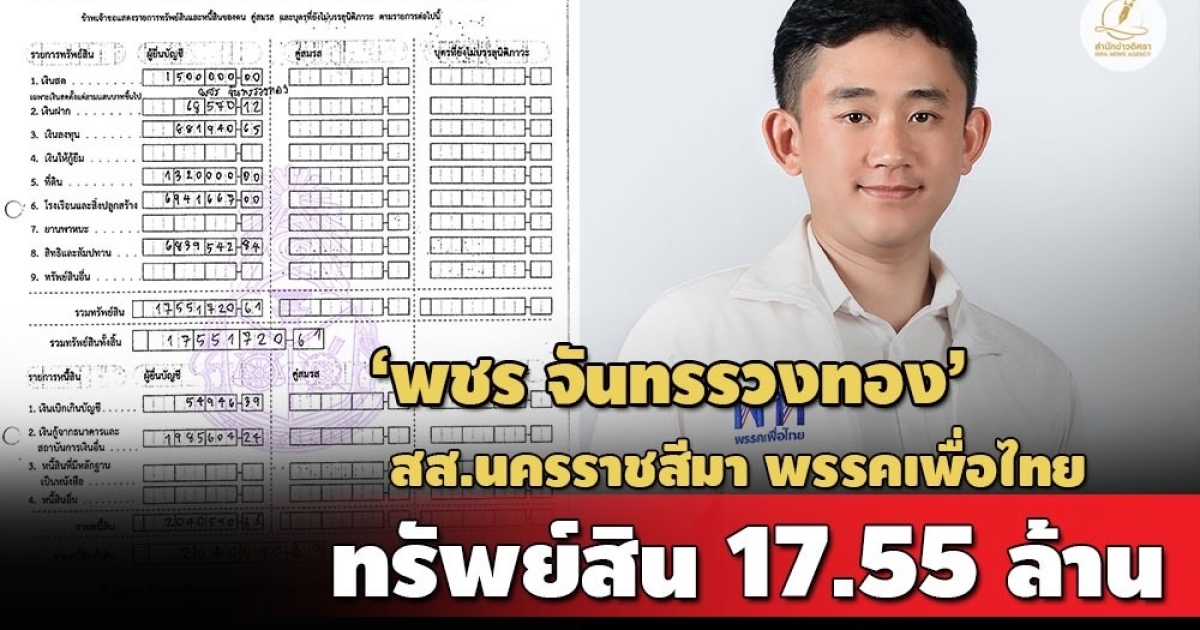 ป.ป.ช.เปิดบัญชีทรัพย์สิน 'พชร จันทรรวงทอง' สส.นครราชสีมา พรรคเพื่อไทย ทรัพย์สินกว่า 17 ล้าน มีคอนโดและบ้านเดี่ยวในนครราชสีมา รายได้ 2 ล./ปี ลงทุนเงินสกุลดิจิทัล
