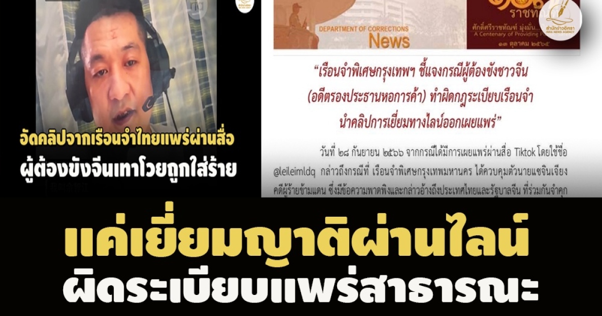 หลัง 'อิศรา' ตีข่าว ผู้ต้องขังจีนเทาอัดคลิปจากคุกไทยแพร่ผ่านสื่อสหรัฐฯโวยถูกใส่ร้าย-หวั่นถูกส่งกลับประเทศ กรมราชทัณฑ์ ออกเอกสารข่าวแจงทันทีเป็นขั้นตอนเยี่ยมญาติผ่านระบบไลน์ใช้มาตั้งแต่ช่วงโควิด มีทำผิดกฎระเบียบข้อบังคับนำออกเผยแพร่สู่สาธารณชน ตัดสิทธิการเยี่ยม พร้อมตั้งคกก.สอบข้อเท็จจริงแล้ว ขู่เล่นงานวินัยชั้นเด็ดขาด