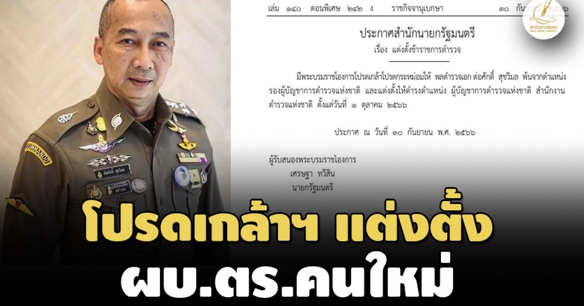 ราชกิจจาฯ เผยแพร่ประกาศสำนักนายกฯ มีพระบรมราชโองการโปรดเกล้าฯ แต่งตั้ง พล.ต.อ.ต่อศักดิ์ สุขวิมล เป็นผบ.ตร. คนใหม่ มีผล 1 ต.ค.2566 นี้