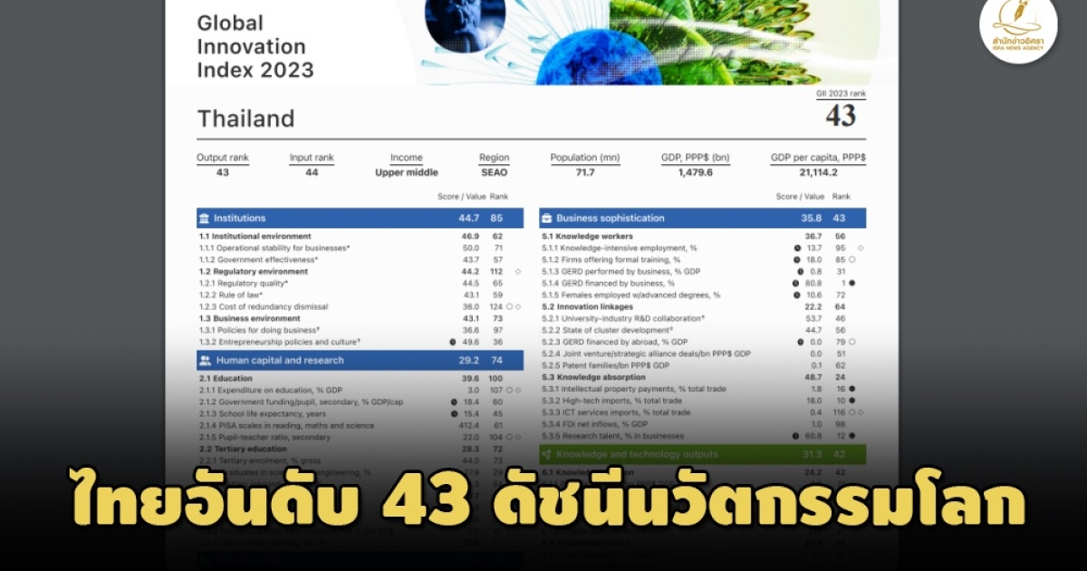 สำนักข่าวอิศรา (www.isranews.org) รายงานว่าเมื่อวันที่ 27 ก.ย. องค์การทรัพย์สินทางปัญญาโลก (WIPO) ได้มีการจัดดัชนีนวัตกรรมโลกประจำปี 2566 หรือ Global Innovation Index 2023 ซึ่งเป็นตัวชี้วัดความสามารถทางด้านนวัตกรรมที่สะท้อนให้เห็นถึงผลผลิตด้านองค์ความรู้ เทคโนโลยี ความคิดสร้างสรรค์ การวิจัยและพัฒนาของแต่ละประเทศกว่า 132 ประเทศทั่วโลก