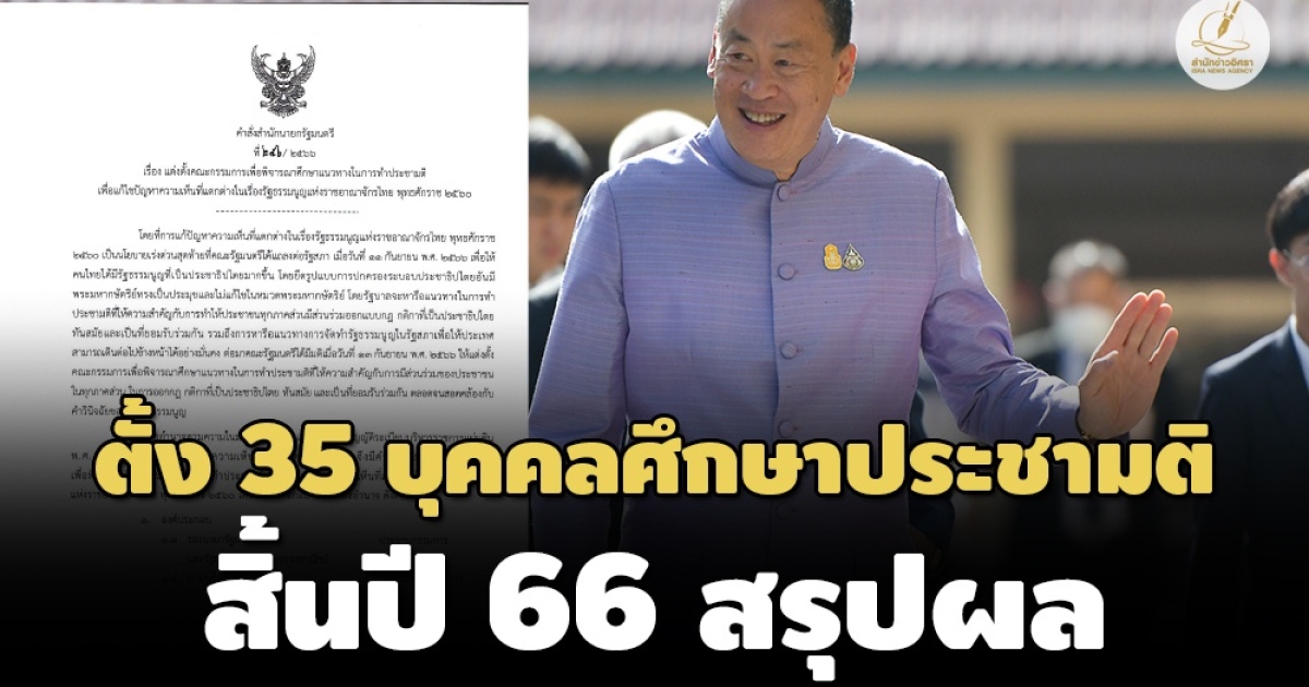 ‘เศรษฐา’ เซ็นตั้ง 35 คณะกรรมการศึกษาประชามติแก้รัฐธรรมนูญแล้ว พบตัวแทนหลากหลายทั้งนักการเมือง-อาจารย์มหาวิทยาลัย-ตำรวจ-นักศึกษา-ประธานสหภาพฯ ‘ภูมิธรรม’ นัดประชุมครั้งแรก 9 ต.ค.นี้ วางกรอบทำงาน เตรียมเดินสายพบทุกภาคส่วน ยันสิ้นปี 66 ศึกษาเสร็จ