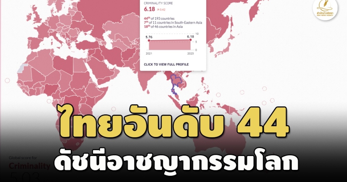 สำนักข่าวอิศรา (www.isranews.org) รายงานว่าสถาบัน Global Initiatives Against Transnational Organized Crime จากสวิตเซอร์แลนด์ ได้มีการจัดทำดัชนีอาชญากรรมระดับโลกหรือ Global Organized Crime Index โดยพบว่าประเทศไทยอยู่ในอันดับที่ 44 จาก 193 ประเทศทั่วโลก (อันดับยิ่งน้อยหมายความว่าสถานการณ์ยิ่งแย่) อันดับ 7 ของภูมิภาคเอเชียตะวันออกเฉียงใต้หรือว่าอาเซียน และ อันดับ 18 จาก 46 ประเทศในทวีปเอเชีย ได้คะแนนอาชญากรรม 6.18 คะแนน (คะแนนยิ่งมากสถานการณ์ยิ่งแย่) และได้คะแนนความยืดหยุ่นในการรับมือ 4.79 คะแนน (คะแนนยิ่งน้อยสถานการณ์ยิ่งแย่) ขณะที่คะแนนเฉลี่ยนอาชญากรรมทั่วโลกอยู่ที่ 5.03 คะแนน