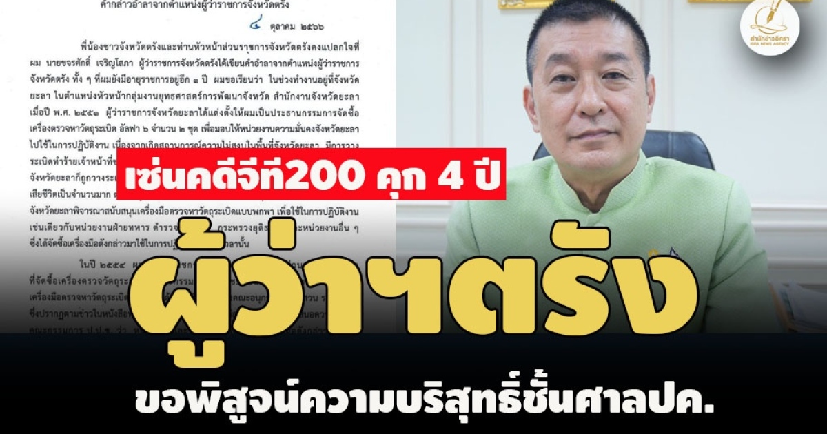 หนังสืออำลาตำแหน่งผู้ว่าฯ ตรังว่อนจังหวัด หลังข่าวสะพัดถูกปลัดมหาดไทย อนุมัติออกราชการ เซ่นคดีจัดซื้อเครื่องจีที 200 ศาลอาญาคดีทุจริตฯภาค 9 พิพากษาลงโทษจำคุก 4 ปี ไม่รอลงอาญา ช่วงดำรงตำแหน่งหน.กลุ่มงานยุทธศาสตร์การพัฒนา จ.ยะลา เป็นจำเลยที่ 2 - เจ้าตัวยัน 40 ปี ในชีวิตราชการไม่ด่างพร้อย ขอพิสูจน์ความบริสุทธิ์ในชั้นศาลปกครอง แม้จะไม่ได้กลับเข้ารับราชการแล้ว