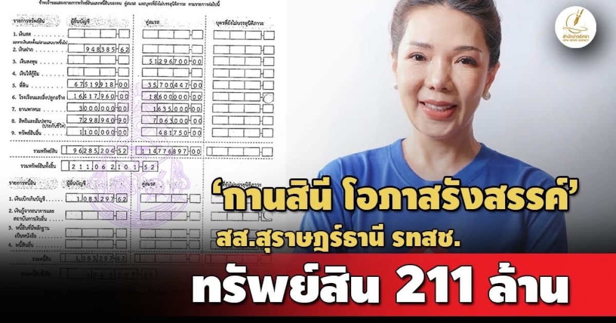 ป.ป.ช.เปิดบัญชีทรัพย์สิน 'กานสินี โอภาสรังสรรค์' สส.สุราษฎร์ธานี พรรครวมไทยสร้างชาติ ทรัพย์สินกว่า 211 ล้าน มีที่ดิน 46 แปลง มีอาคารพาณิชย์ 17 หลัง -ตึกแถว 2 หลัง สะสมนาฬิหาหรู-อาวุธปืน รายได้ 4.8 ล้าน/ปี