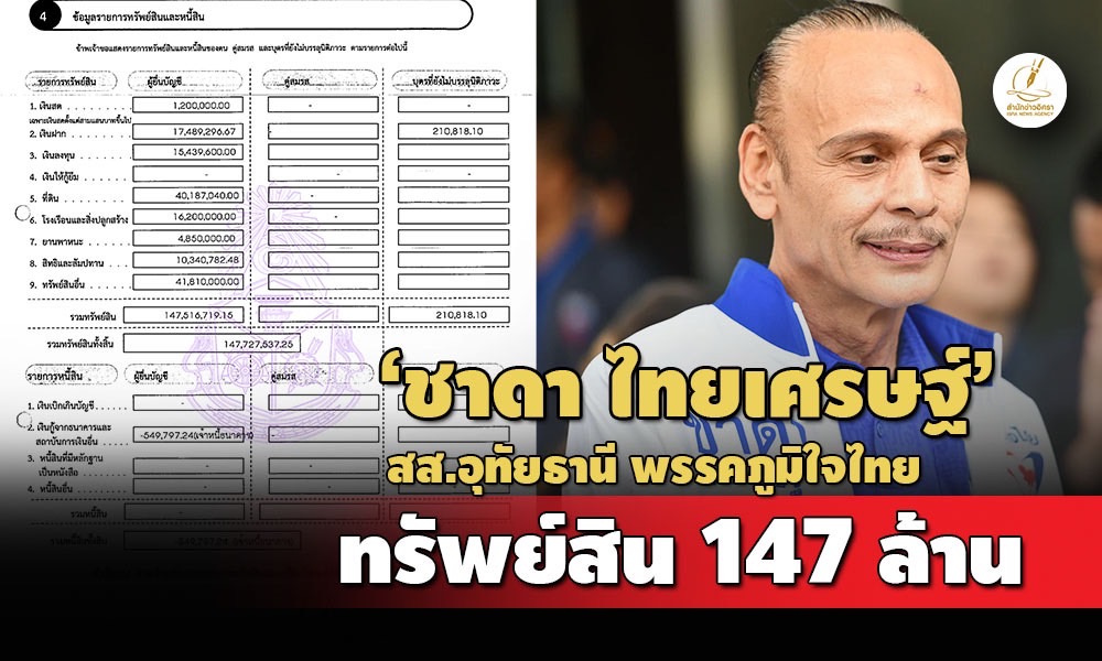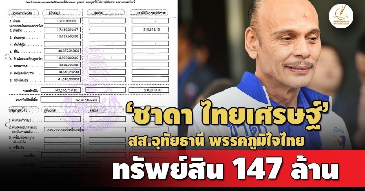 โดยนายชาดา และบุตรที่ยังไม่บรรลุนิติภาวะ แจ้งมีทรัพย์สินทั้งสิ้น 147,727,537 บาท หนี้สิน 549,797 บาท