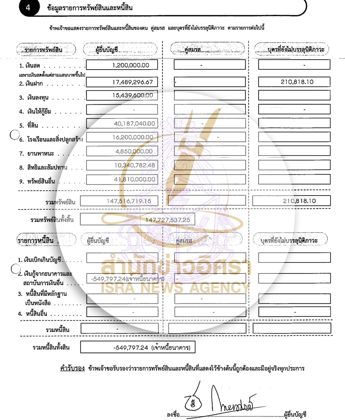 สำหรับ บุตรที่ยังไม่บรรลุนิติภาวะ แจ้งมีทรัพย์สิน 210,818 บาท เป็นเงินฝาก 4 บัญชี
