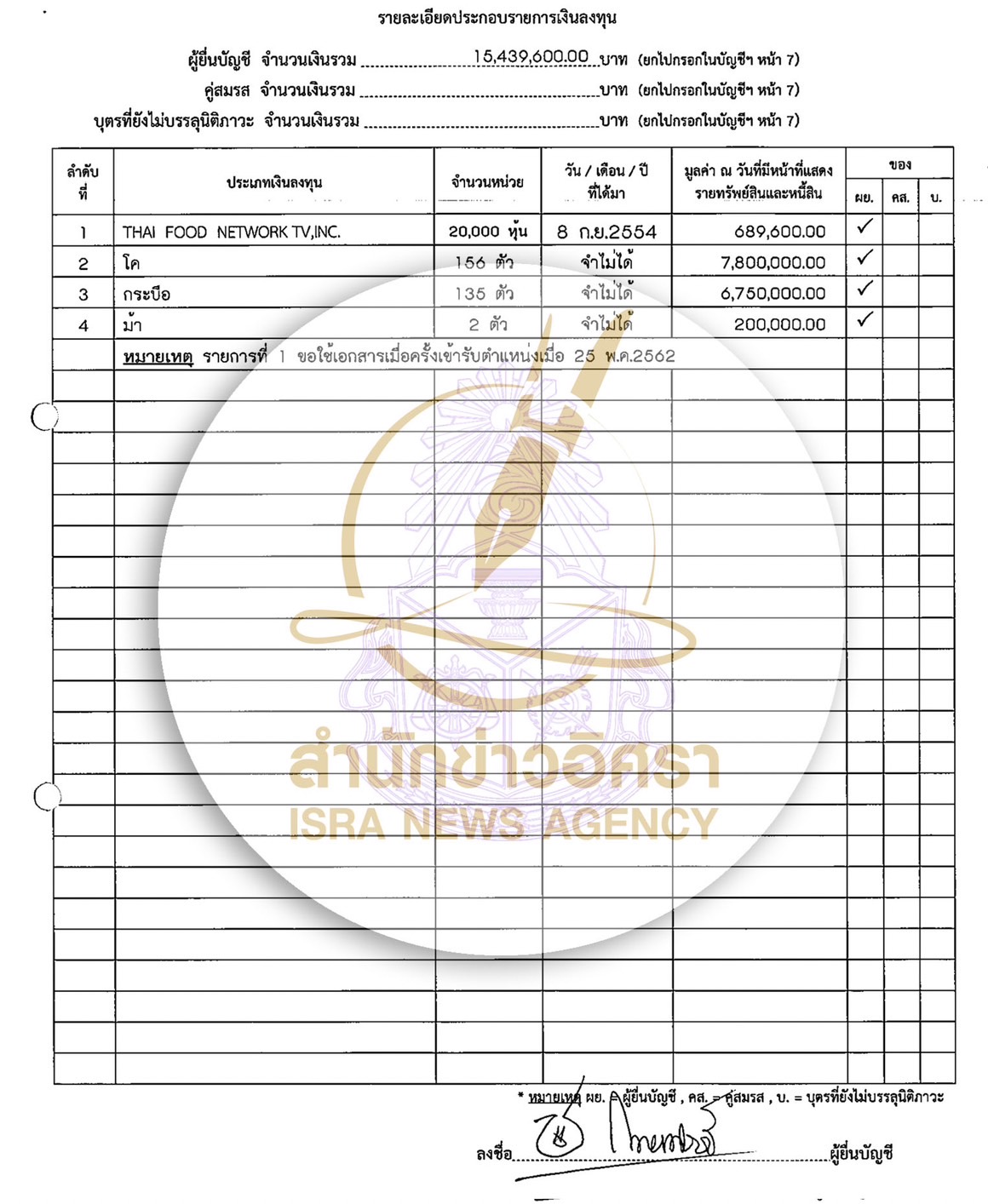 เงินลงทุน 15,439,600 บาท ประกอบด้วย THAI FOOD NETWORK TV,INC. จำนวน 20,000 หุ้น มูลค่า 689,600 บาท โค 156 ตัว มูลค่า 7,800,000 บาท กระบือ 135 ตัว 6,750,000 บาท ม้า 2 ตัว มูลค่า 200,000 บาท