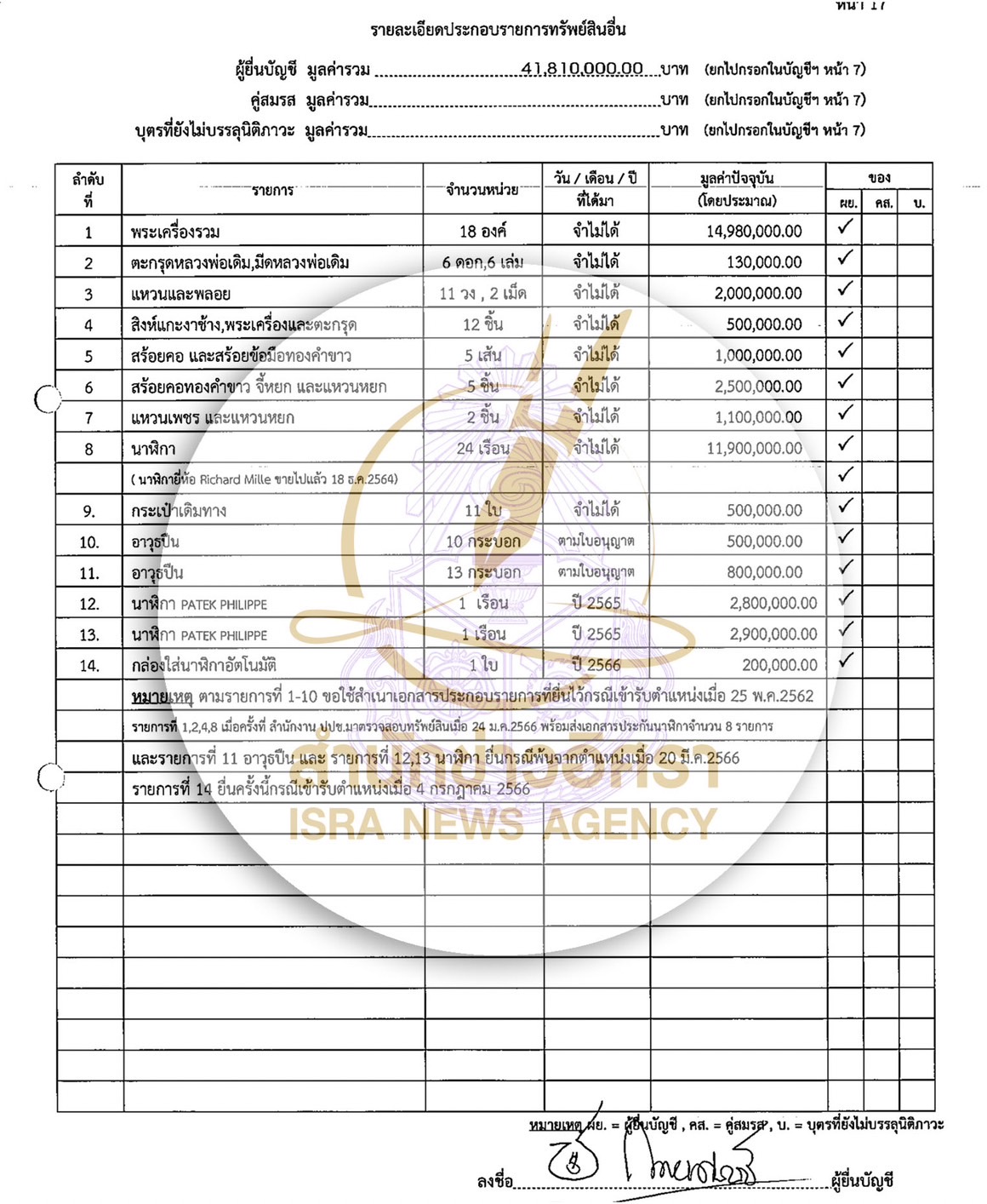 แหวนเพชรและแหวนหยก 2 ชิ้น มูลค่า 1,100,000 บาท นาฬิกา 24 เรือน (ยี่ห้อ Richard Mille ขายไปแล้ว 18 ธ.ค. 2564) มูลค่า 11,900,000 บาท กระเป๋าเดินทาง 11 ใบ มูลค่า 500,000 บาท