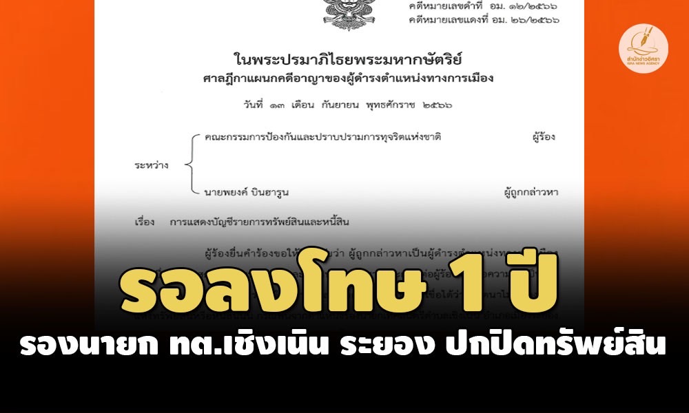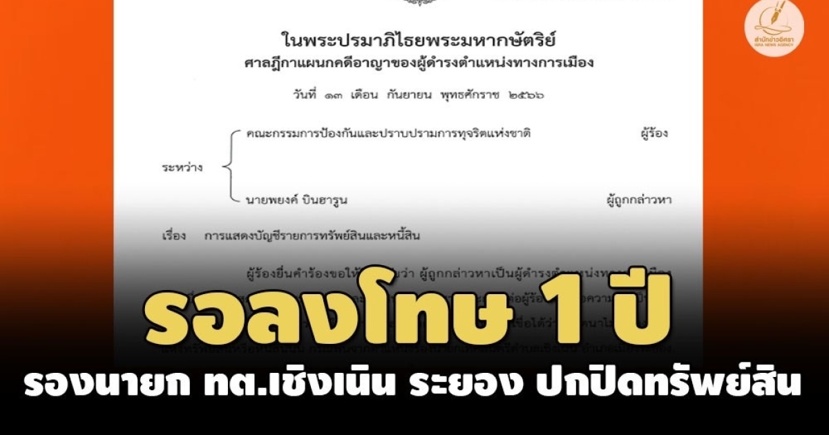 - ศาลฎีกาฯสั่ง จำคุก1 เดือน รองนายก อบต.บ้านฉาง ปทุมธานี จงใจไม่ยื่นบัญชีฯ-รอลงโทษ